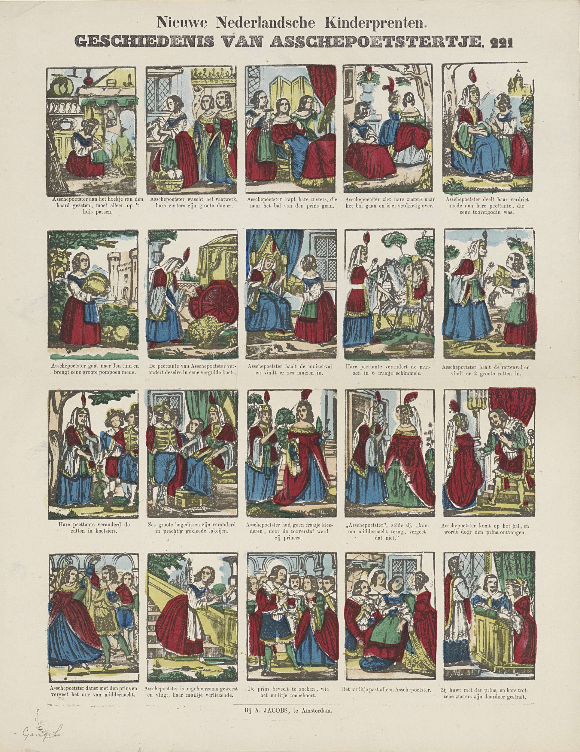 Blad met 20 voorstellingen uit het sprookje van Assepoester. Onder elke afbeelding een onderschrift. Genummerd rechtsboven: 221.