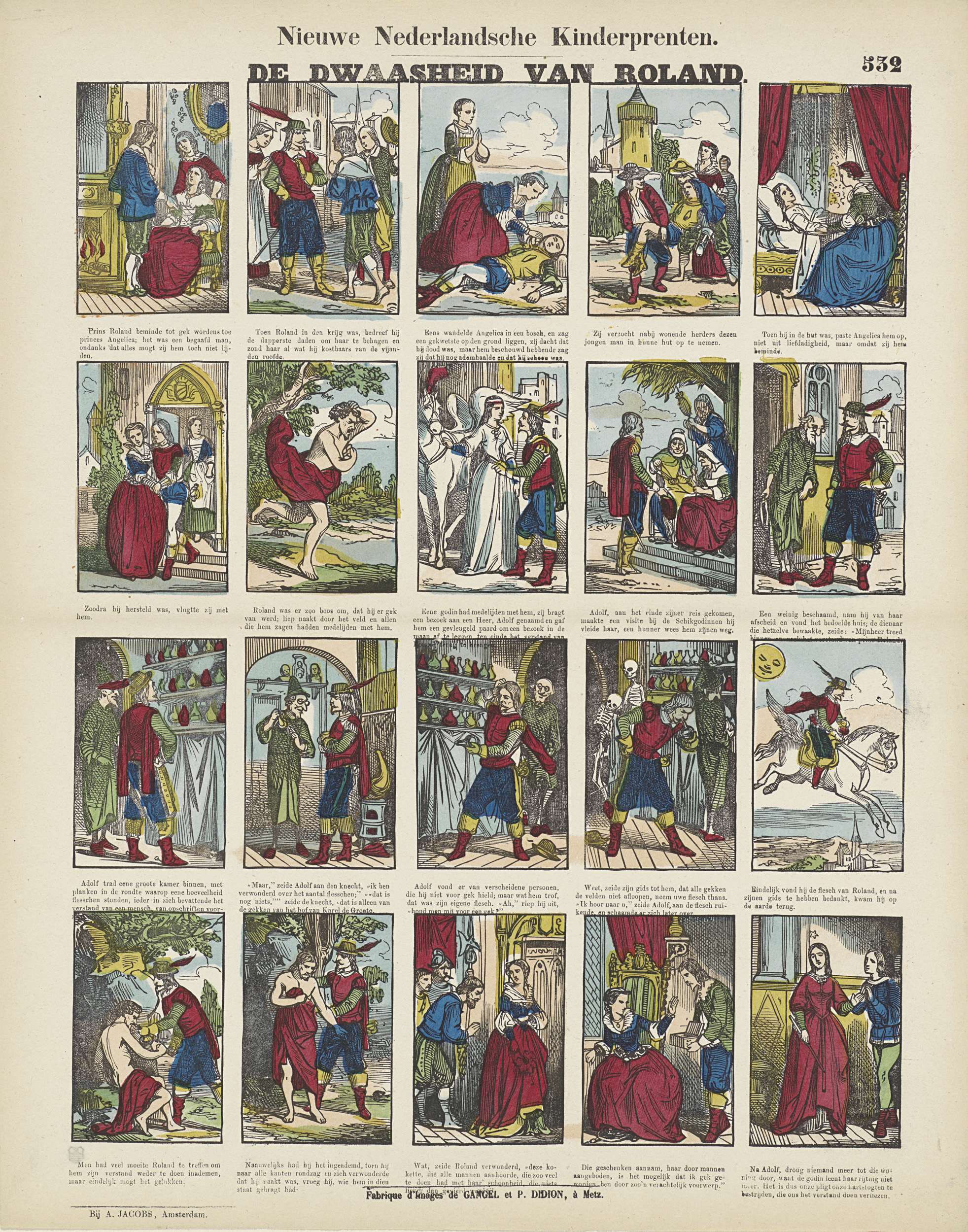 Blad met 20 voorstellingen uit het verhaal van razende Roland. Onder elke afbeelding een onderschrift. Genummerd rechtsboven: 532.