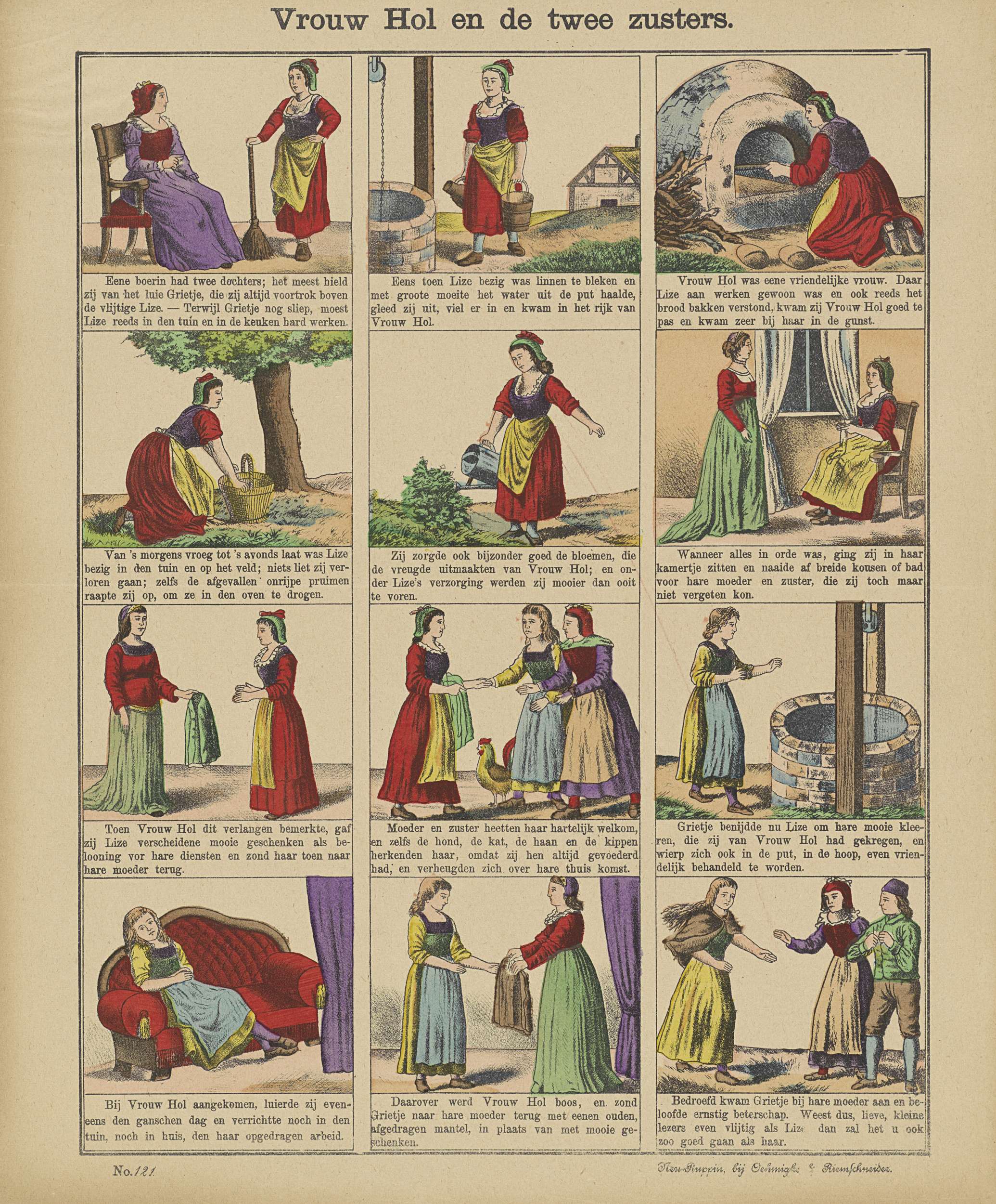 Blad met 16 voorstellingen uit het sprookje van Vrouw Holle en de twee zusters Grietje en Liesje. Onder elke afbeelding een onderschrift. Genummerd linksonder: No. 121.