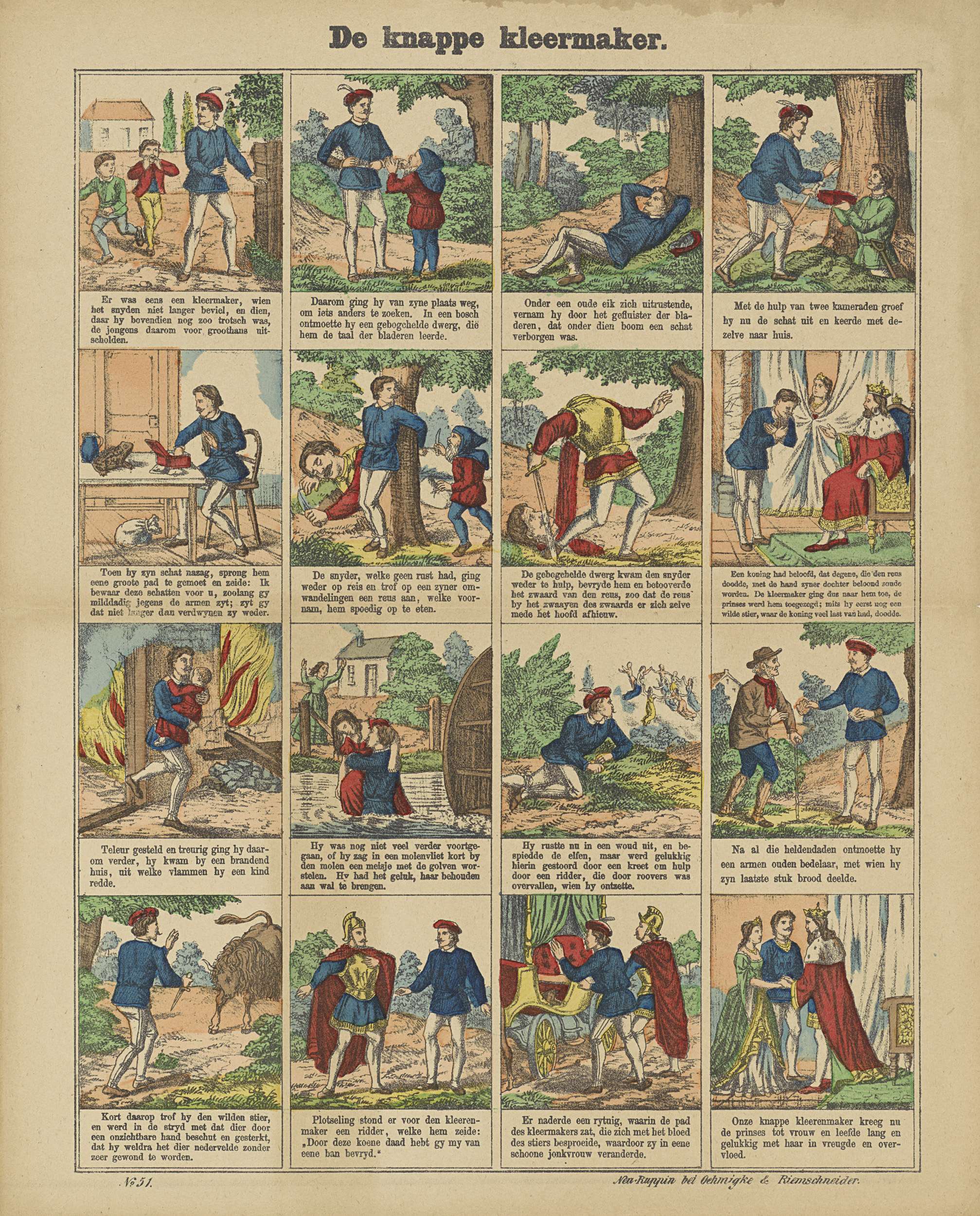 Blad met 16 voorstellingen uit het verhaal van de knappe kleermaker, die heldendaden verricht en met een prinses trouwt. Onder elke afbeelding een onderschrift. Genummerd linksonder: No. 51.