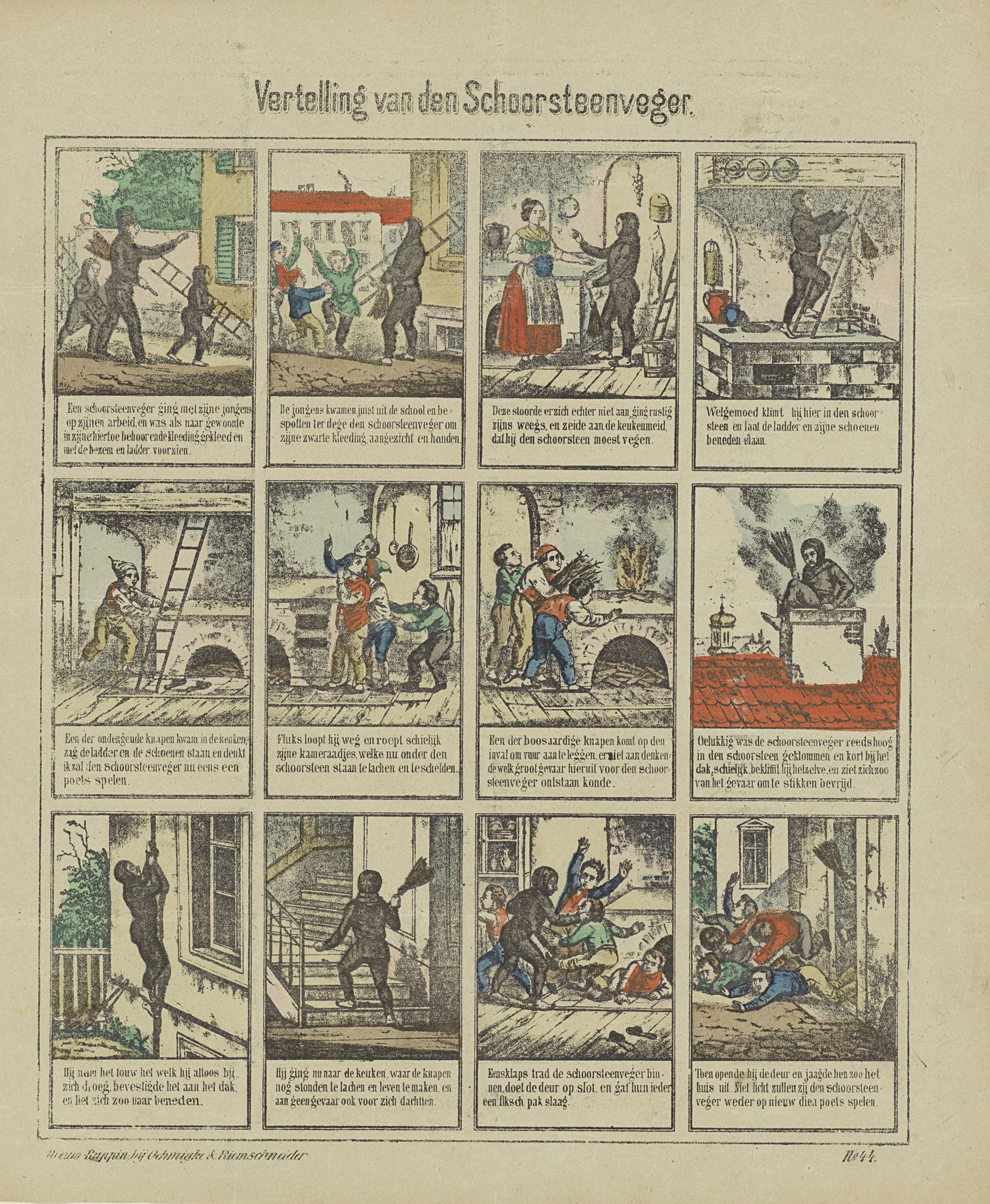 Blad met 12 voorstellingen uit het verhaal van de schoorsteenveger, over kwajongens die een vuur stoken terwijl een schoorsteenveger aan het werk is. Onder elke afbeelding een onderschrift. Genummerd rechtsonder: No. 44.