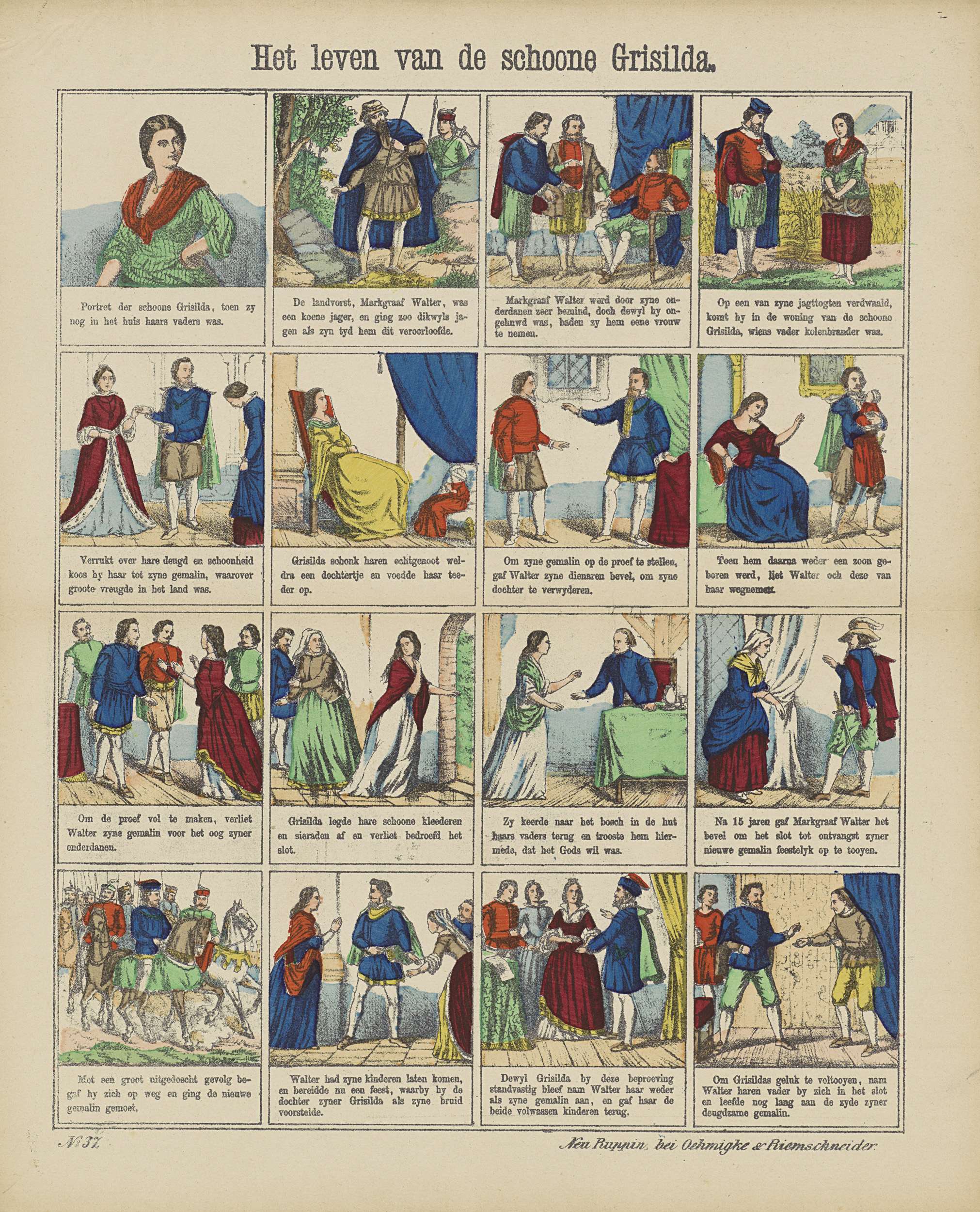 Blad met 16 voorstellingen uit het verhaal van de schone Grisilda, over Markgraaf Walter die zijn vrouw Grisilda op de proef stelt door haar kinderen van haar weg te nemen en vijftien jaar lang van haar te scheiden, om vervolgens weer met haar te trouwen. Onder elke afbeelding een onderschrift. Genummerd linksonder: No. 37.