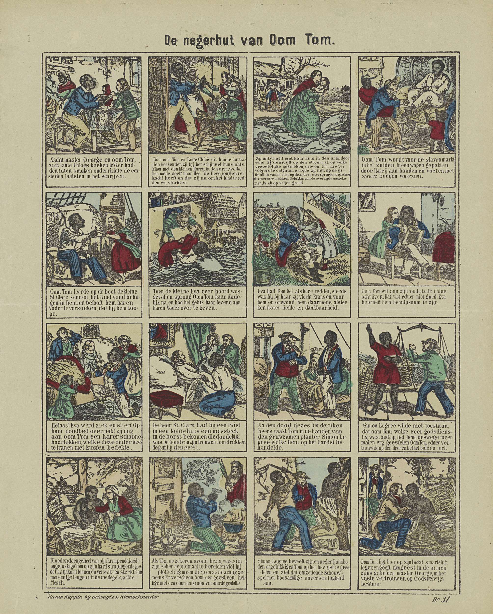Blad met 16 voorstellingen uit het verhaal van de hut van oom Tom. Onder elke afbeelding een onderschrift. Genummerd rechtsonder: No. 31.