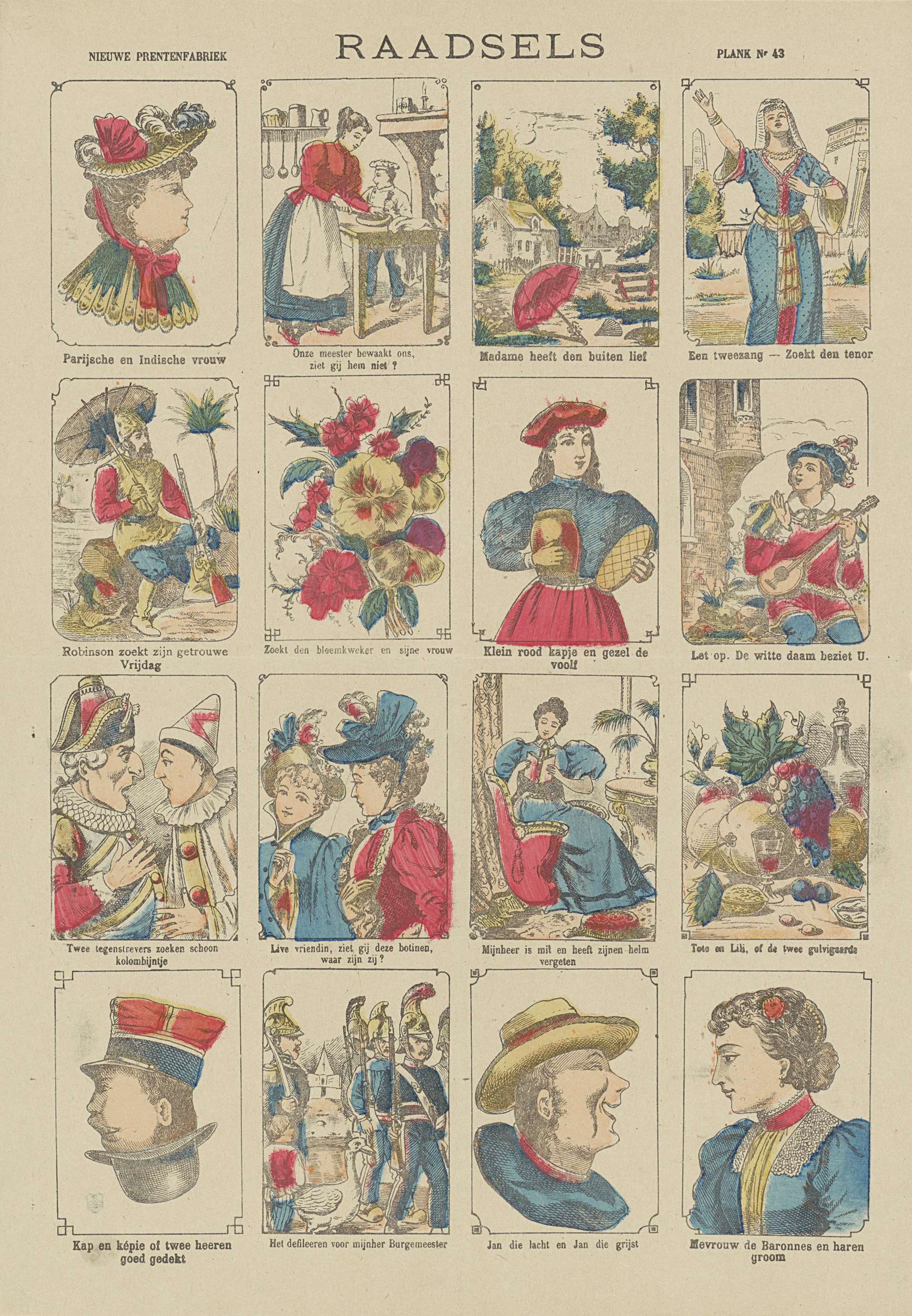 Blad met 16 voorstellingen van verschillende aard, waaronder Robinson Crusoe die Vrijdag zoekt, een stilleven met fruit en wijn en een barones. Onder elke afbeelding een onderschrift (raadsels). Genummerd rechtsboven: PLANK Nr 43.