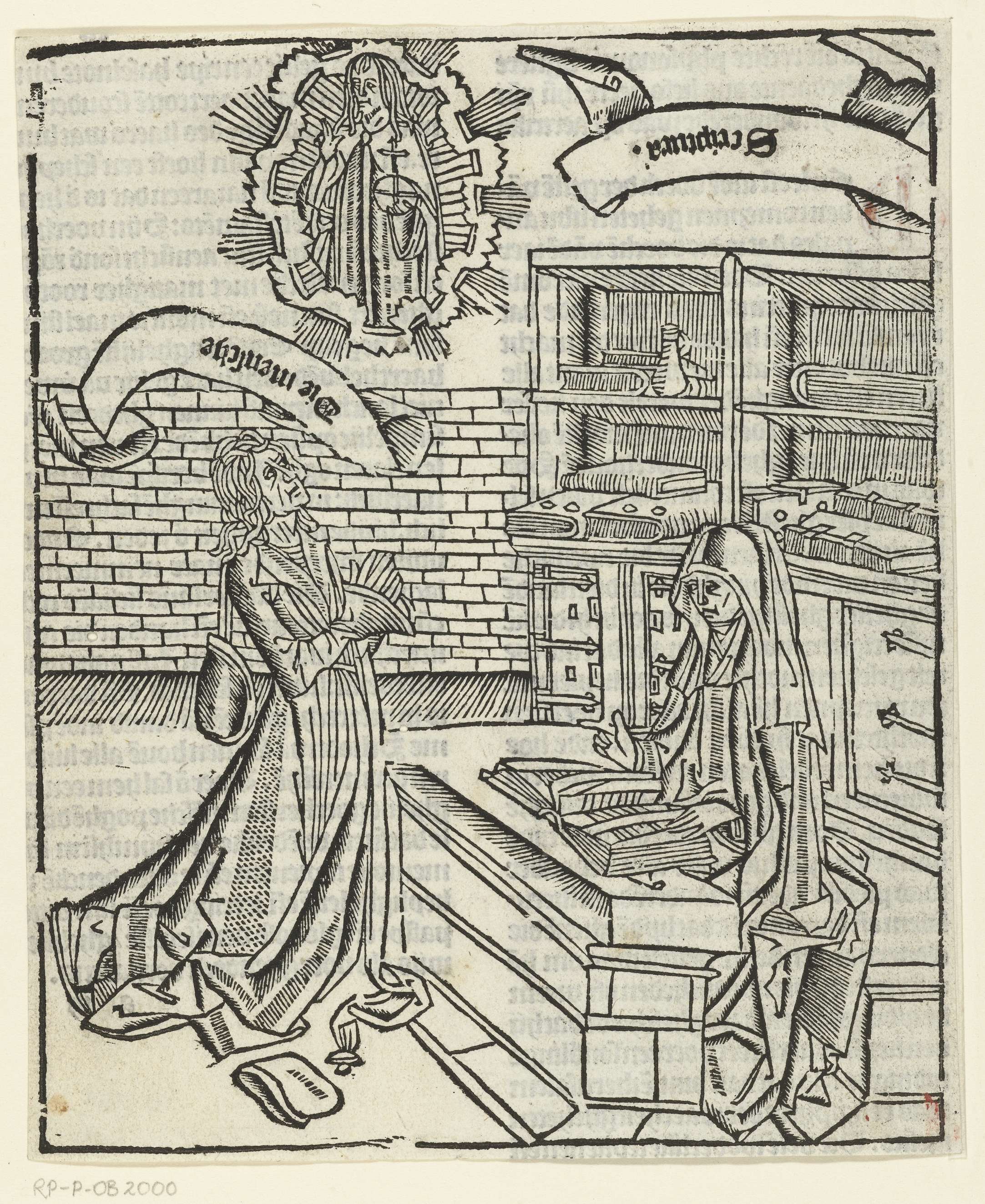 Een man geknield. Een vrouw kijkt in het boek, achter haar een boekenkast. Zij is de personificatie van de Scriptura, van de bijbel. Christus als Salvator Mundi verschijnt aan de hemel.