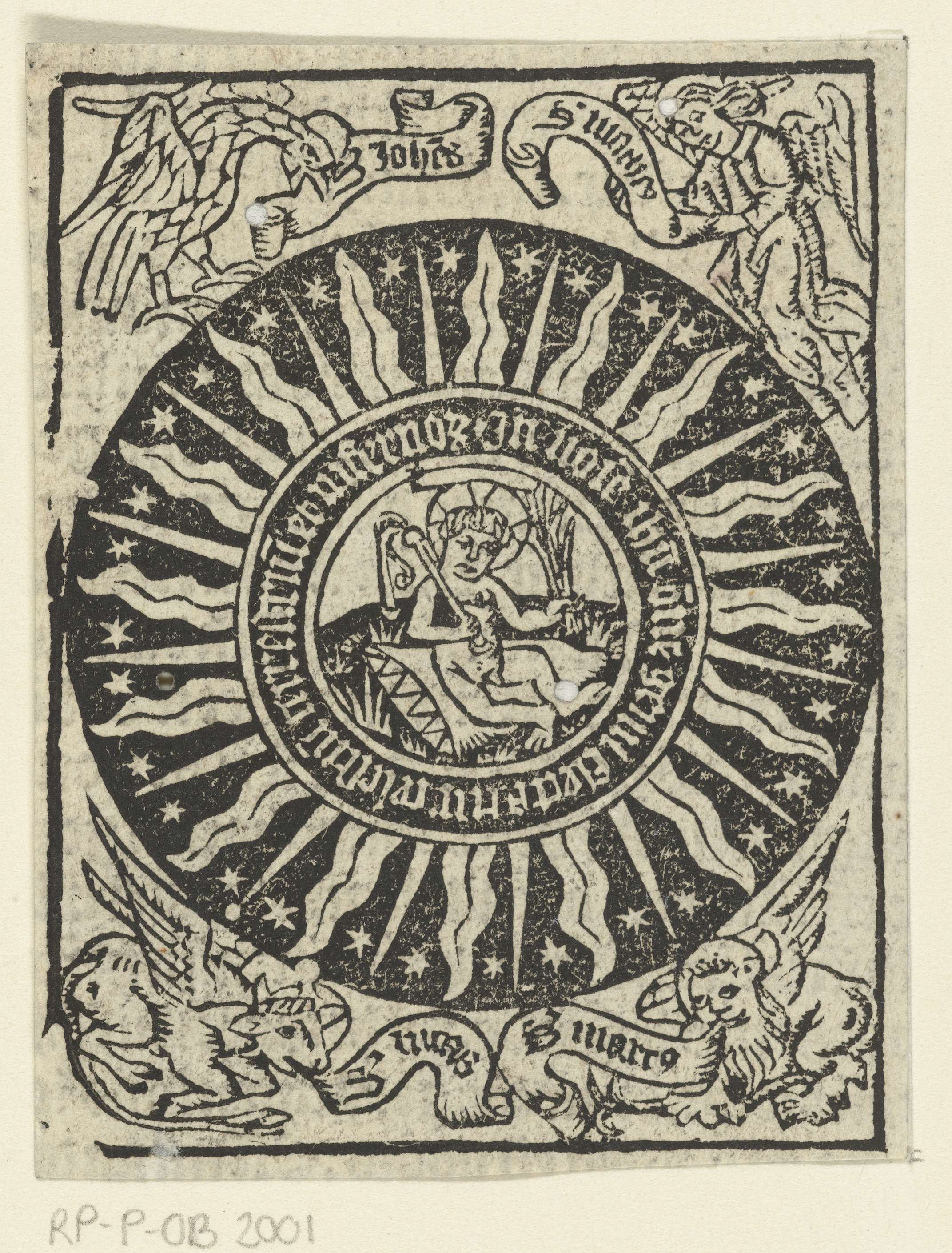 Binnen een stralenkrans en ring met tekst zit het Christuskind en kastijdt zichzelf. Buiten de cirkel, in de hoeken de vier evangelistensymbolen.