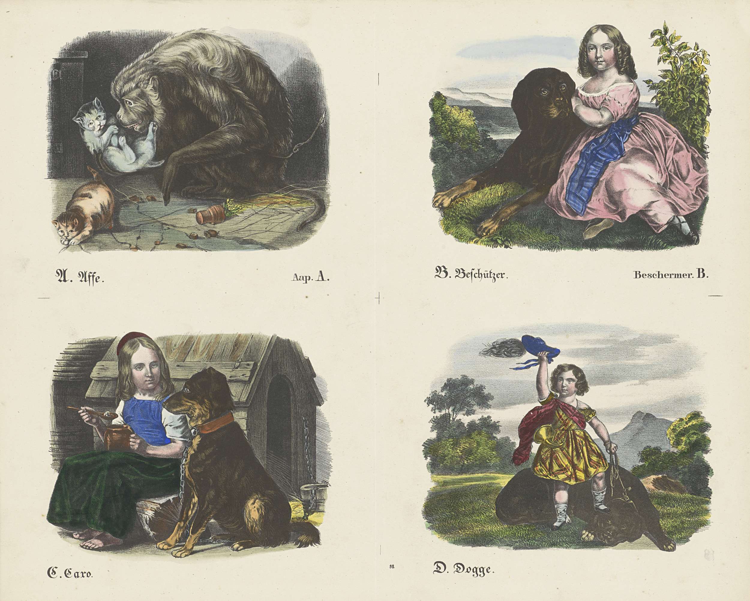 Blad met 4 voorstellingen om uit te knippen en samen tot boekje over het alfabet te binden. Verbeeldingen van de letters A (Aap), B (Beschermer), C (Caro) en D (Dogge = hond). Onder elke afbeelding een onderschrift in het Duits en in het Nederlands (behalve bij de letters C en D).