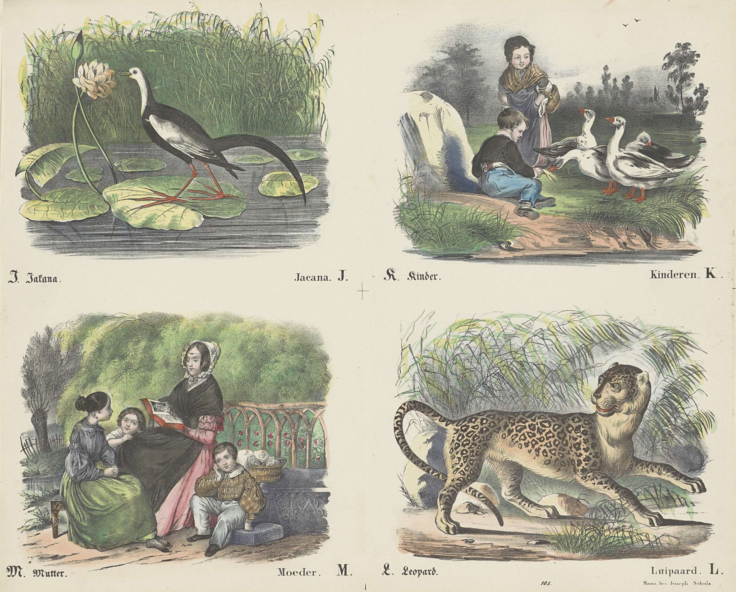 Blad met 4 voorstellingen om uit te knippen en samen tot boekje over het alfabet te binden. Verbeeldingen van de letters J (Jacana), K (Kinderen), M (Moeder) en L (Luipaard). Onder elke afbeelding een onderschrift in het Duits en in het Nederlands. Genummerd rechtsonder: No. 105.