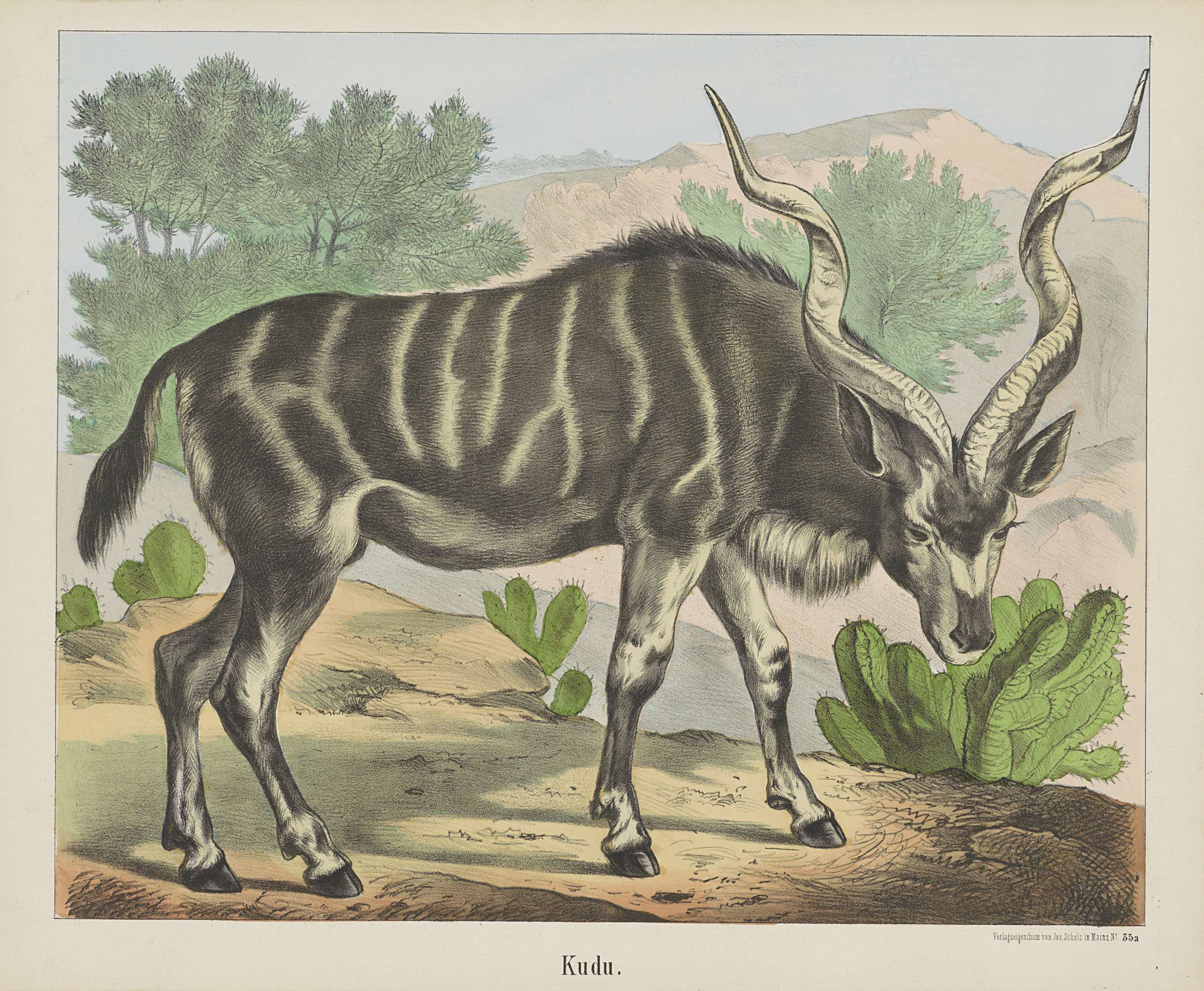 Een koedoe in een berglandschap met cactussen. Genummerd rechtsonder: No. 35a.
