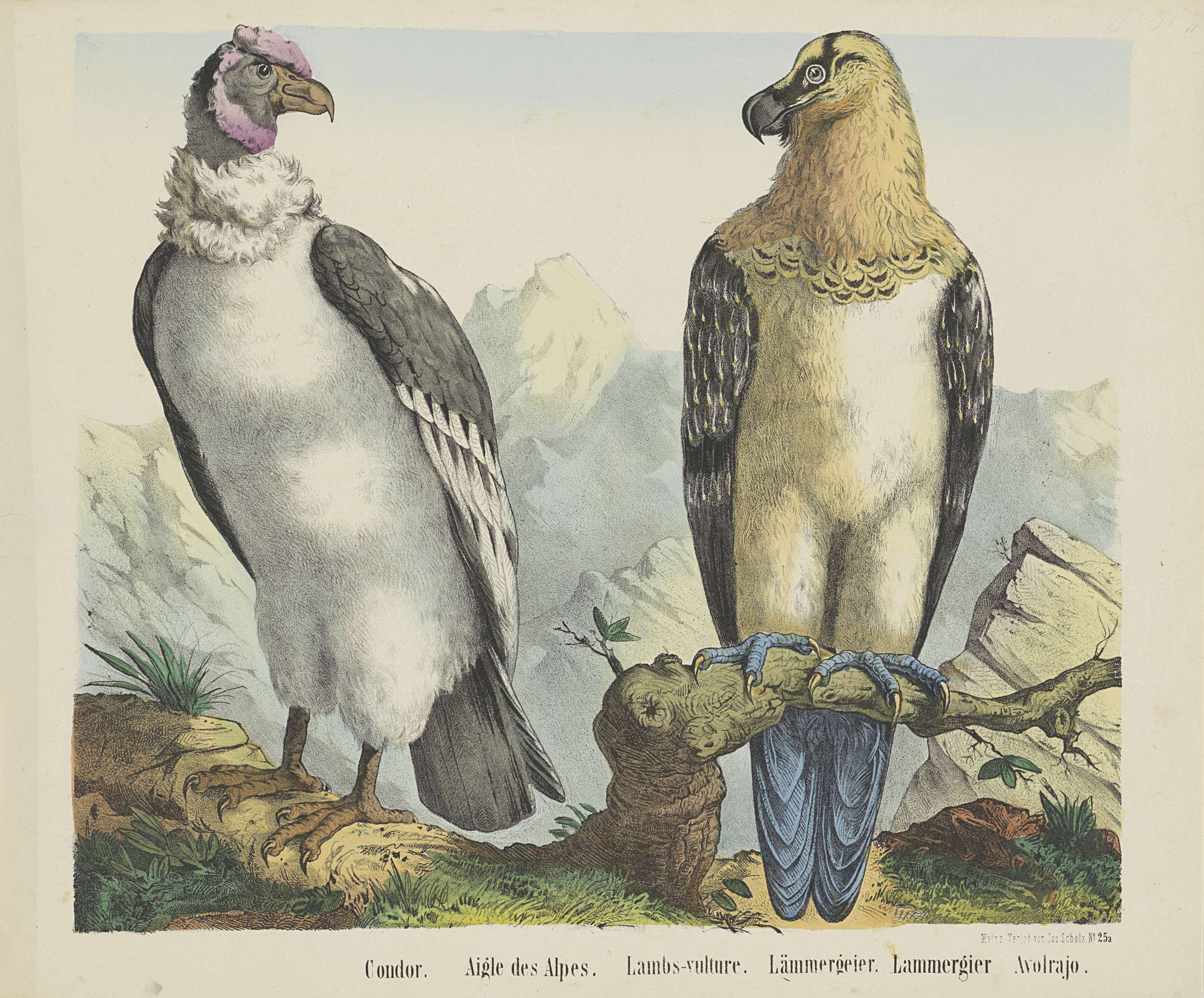 Twee gieren, waarvan één op een tak, in een berglandschap. Genummerd rechtsonder: No. 25a.