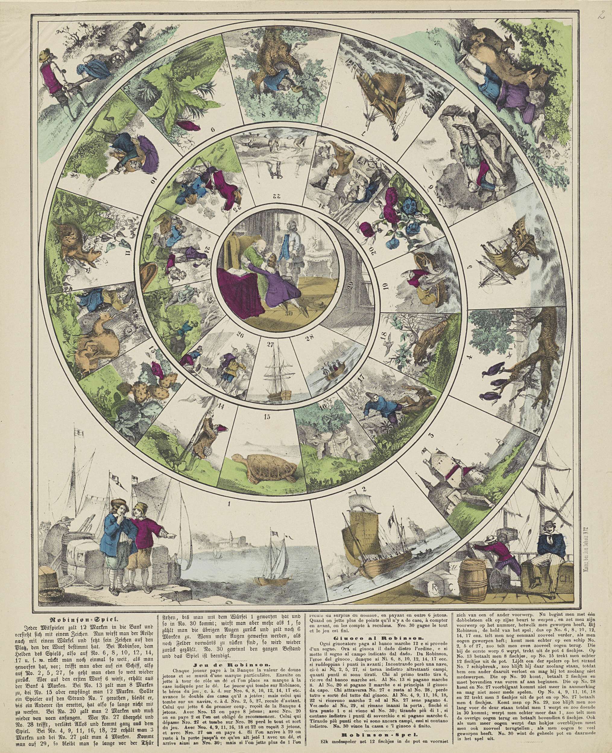 Bordspel met vakjes genummerd van 1 tot en met 30. In de vakjes voorstellingen uit het verhaal van Robinson Crusoe. Onder de voorstelling de spelregels in het Duits, Frans, Italiaans en Nederlands. Genummerd rechts: No. 2.