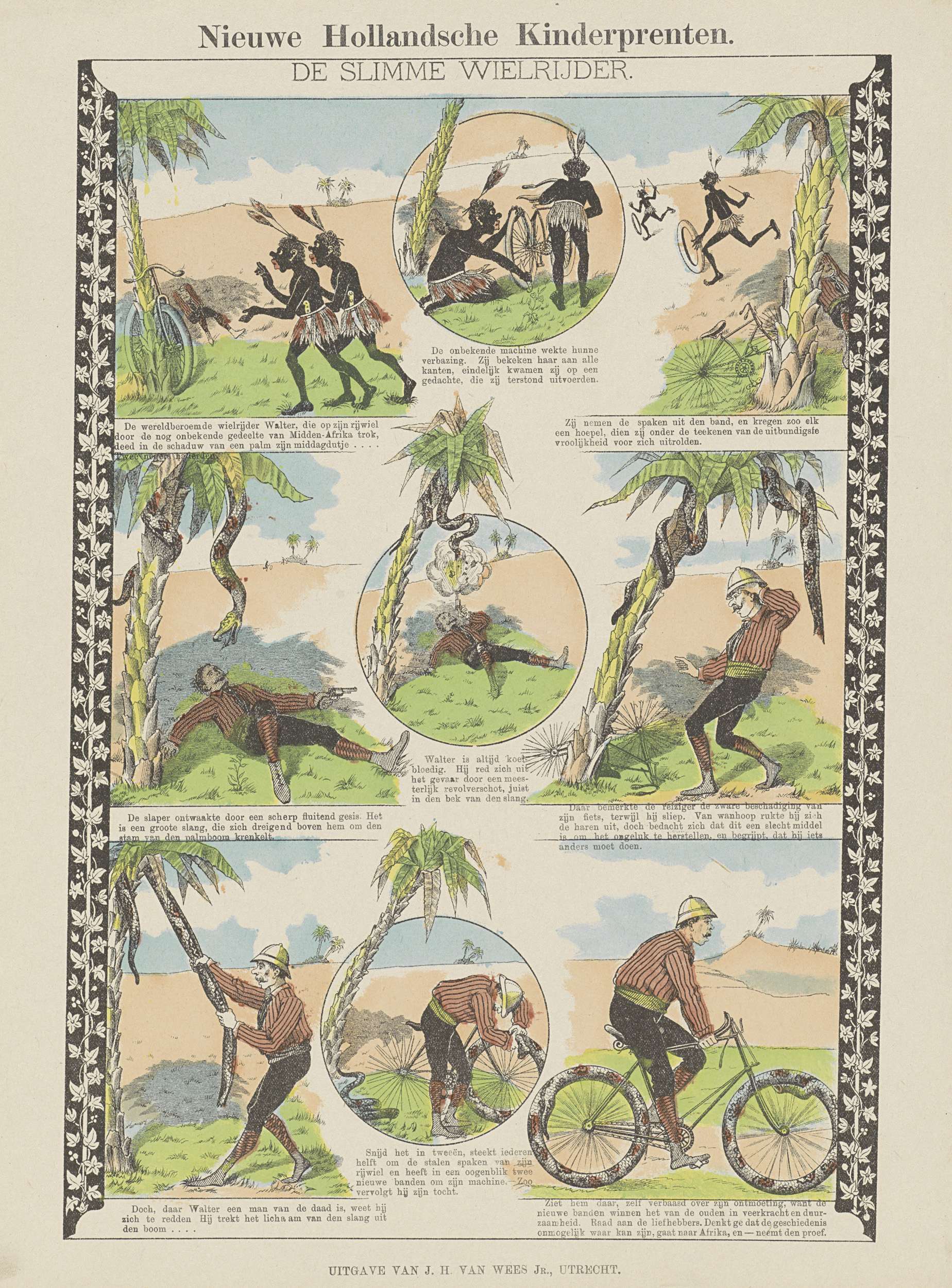 Blad met verschillende voorstellingen over de fietser Walter, wiens fietsbanden gestolen worden. Hij vervangt de banden door een dode slang. Onder de verschillende scènes onderschrift in boekdruk.