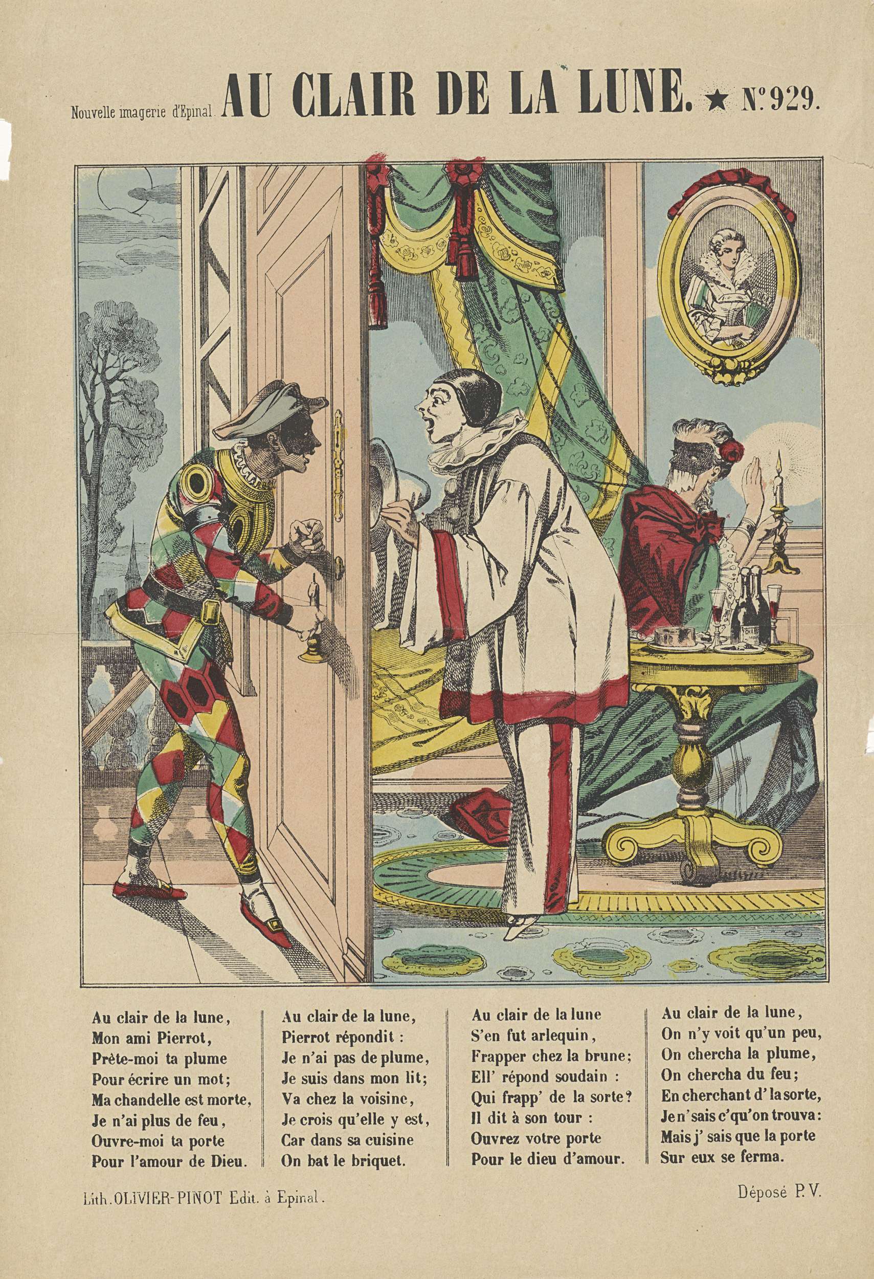 Harlekijn staat voor de deur van Pierrot, die doet alsof hij niet thuis is. Onder de voorstelling een onderschrift in het Frans in vier kolommen. Genummerd rechtsboven: No. 929.