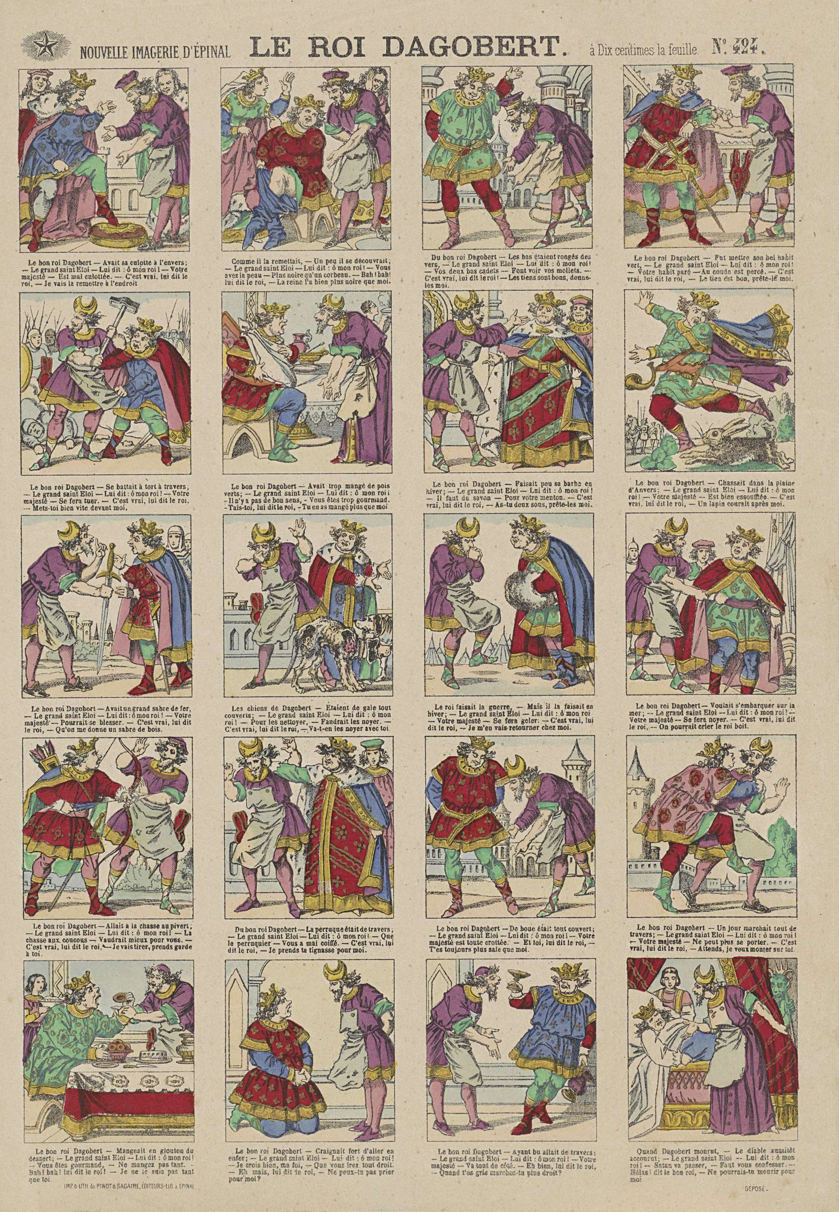Blad met 16 voorstellingen over het leven van koning Dagobert. Onder elke voorstelling een onderschrift in het Frans. Genummerd rechtsboven: No. 424.