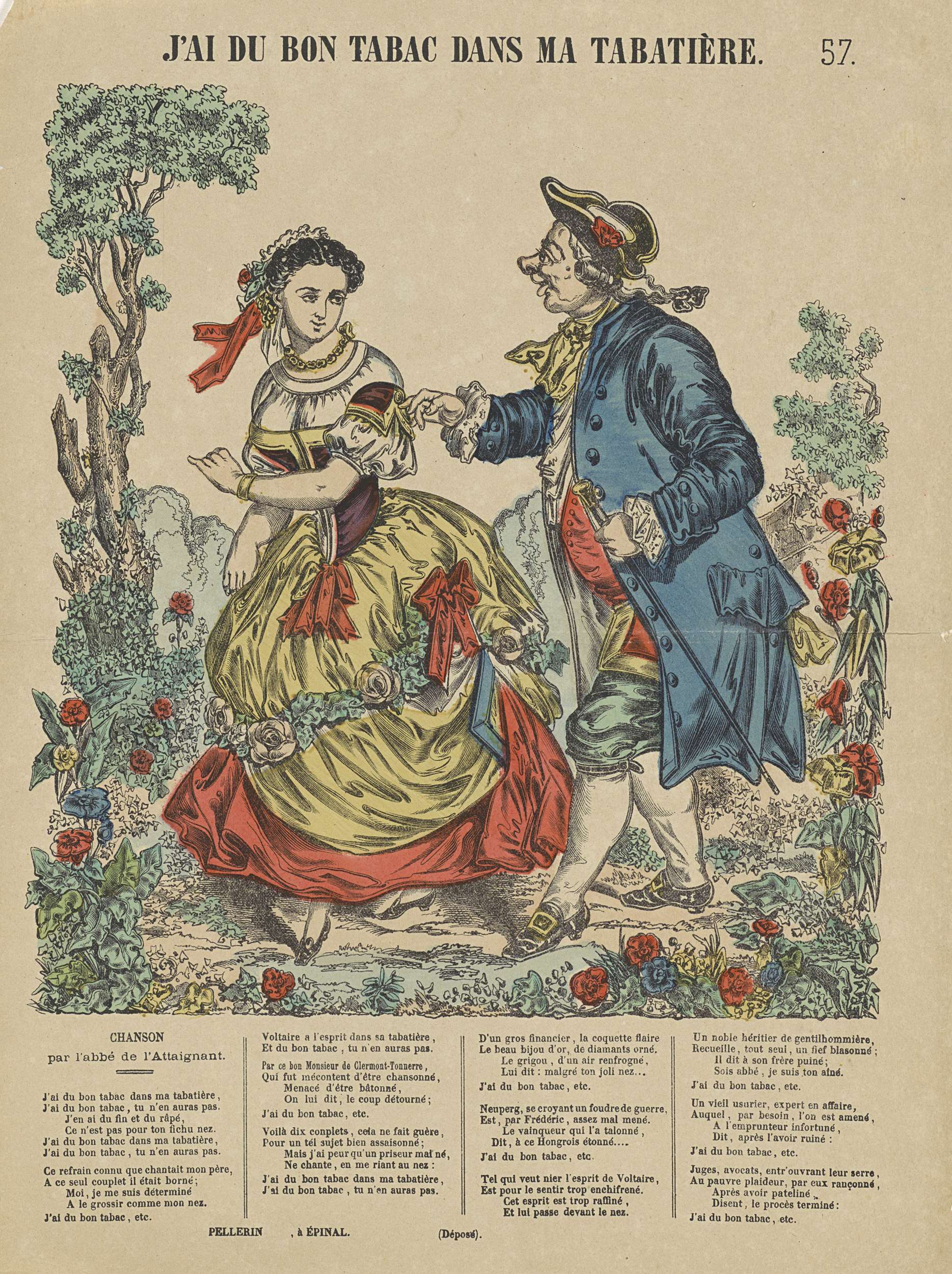 Een mooie dame en een lelijke oudere man in een tuin met bloemen. Onder de voorstelling een Frans gedicht in vier kolommen. Genummerd rechtsboven: No. 57.