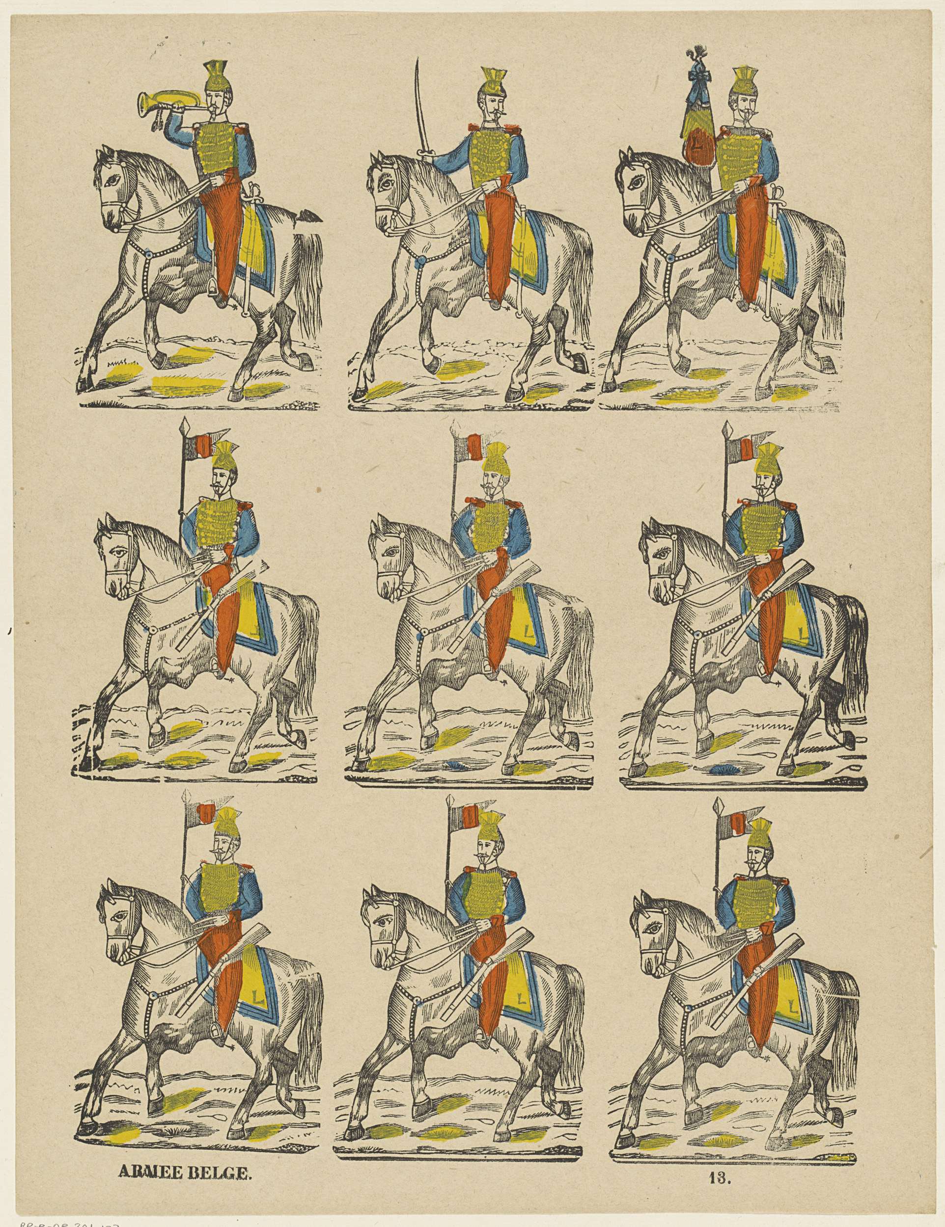 Blad met 9 voorstellingen van Belgische militairen te paard. Genummerd rechtsonder: 13.