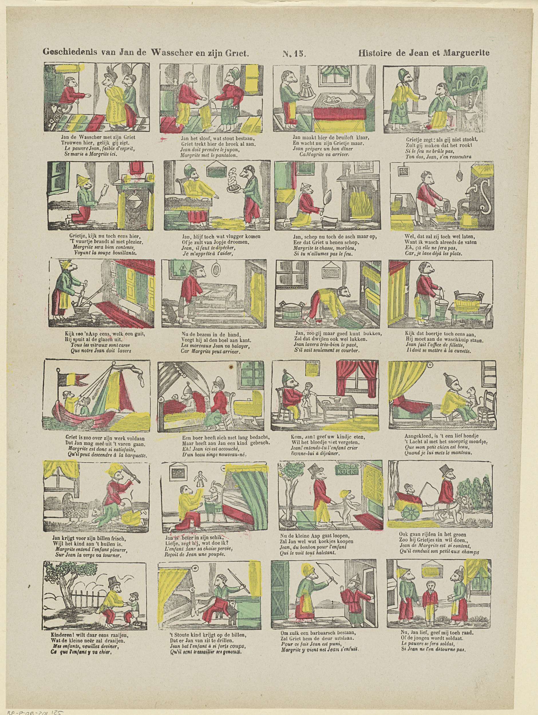 Blad met 24 voorstellingen uit het leven van Jan de Wasser, een man die van zijn vrouw Griet, die de broek aan heeft, al het huishoudelijk werk moet doen, hier uitgebeeld door honden die zich als mensen gedragen. Onder elke afbeelding een tweeregelig vers in het Nederlands en in het Frans. Genummerd midden boven: N. ...