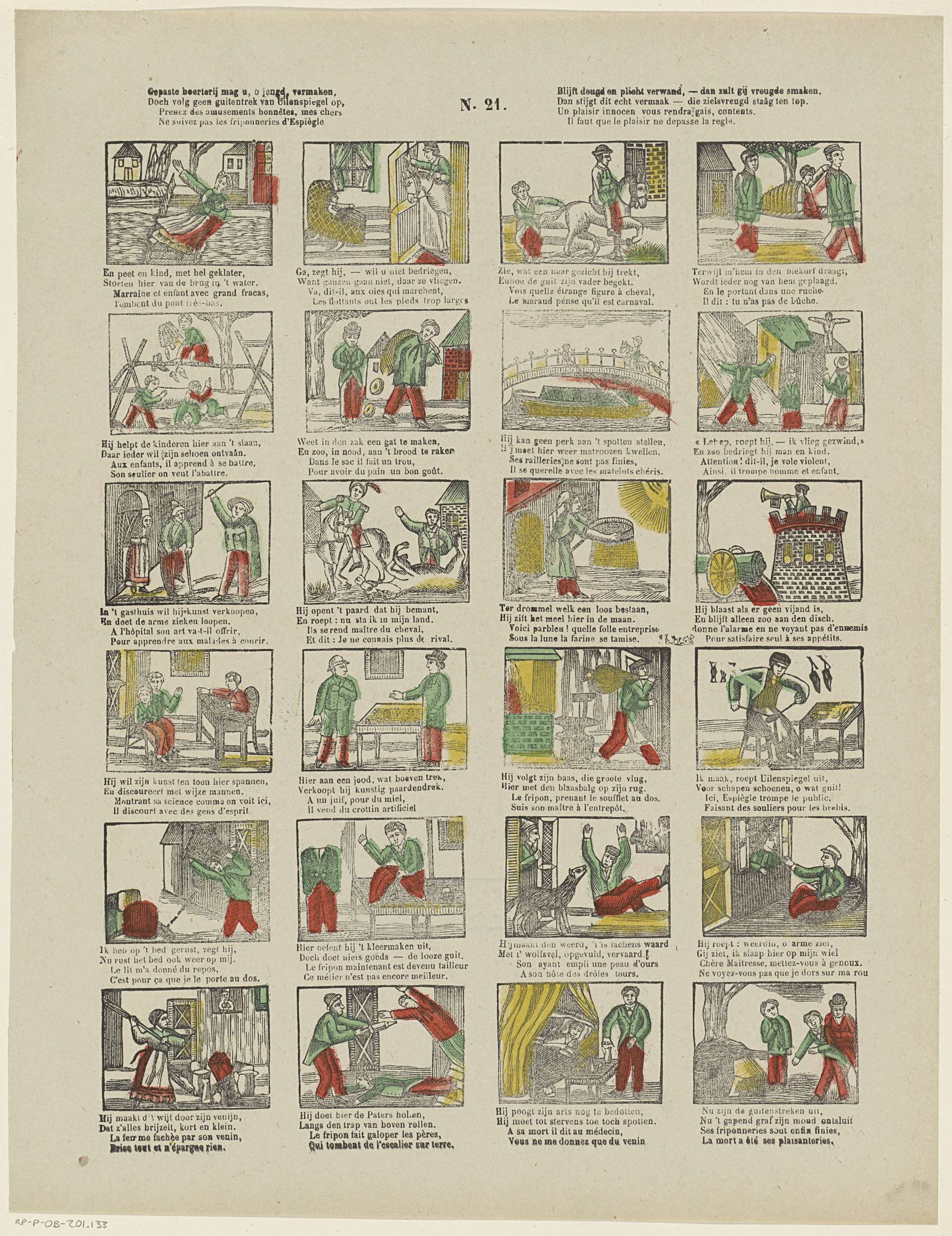 Blad met 24 voorstellingen over het leven van Tijl Uilenspiegel. Onder elke afbeelding een tweeregelig vers in het Nederlands en in het Frans. Genummerd midden boven: N. 21.