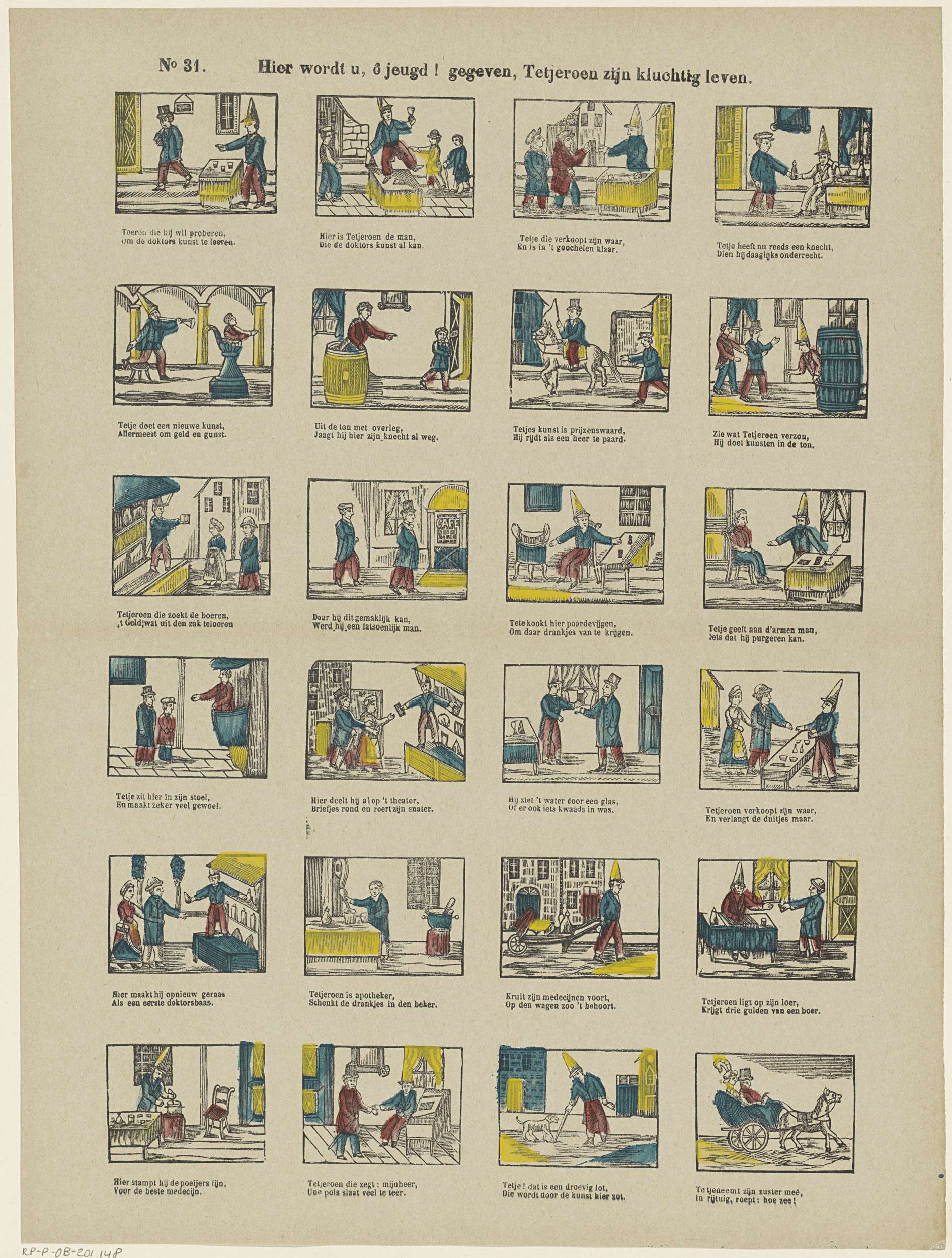 Blad met 24 voorstellingen over het leven van de kwakzalver en grappenmaker Tetjeroen. Onder elke afbeelding een tweeregelig vers. Genummerd linksboven: No 31.