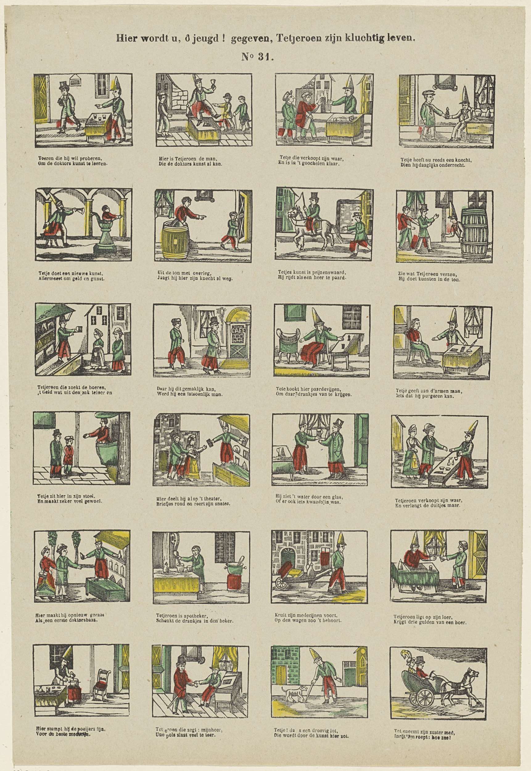 Blad met 24 voorstellingen over het leven van de kwakzalver en grappenmaker Tetjeroen. Onder elke afbeelding een tweeregelig vers. Genummerd midden boven: No 31.