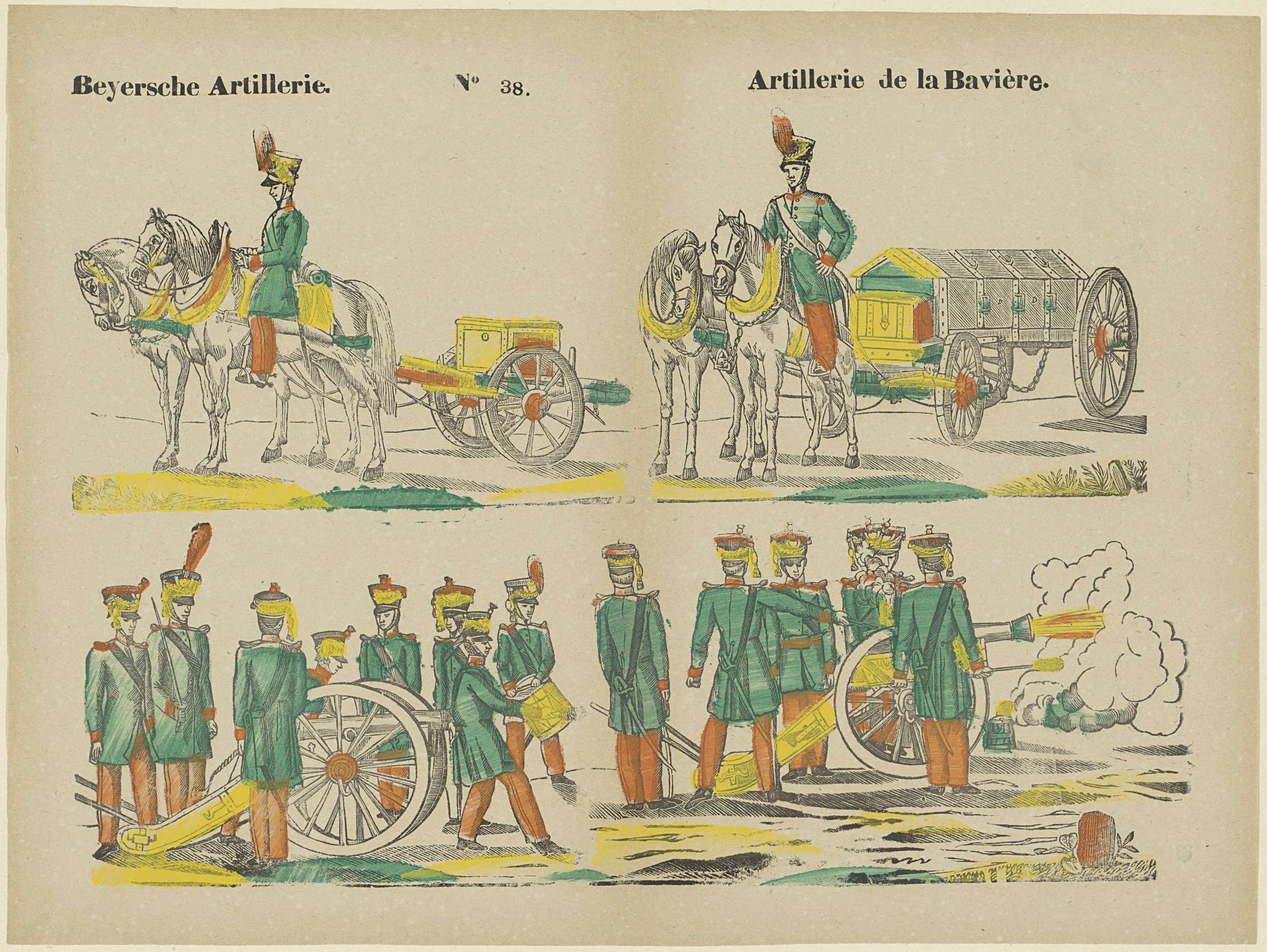 Blad met 2 horizontale rijen met voorstellingen van militairen uit Beieren. Boven: militairen met karren met voorraad. Onder: soldaten die kanonnen laden en afvuren. Genummerd midden boven: No 38.