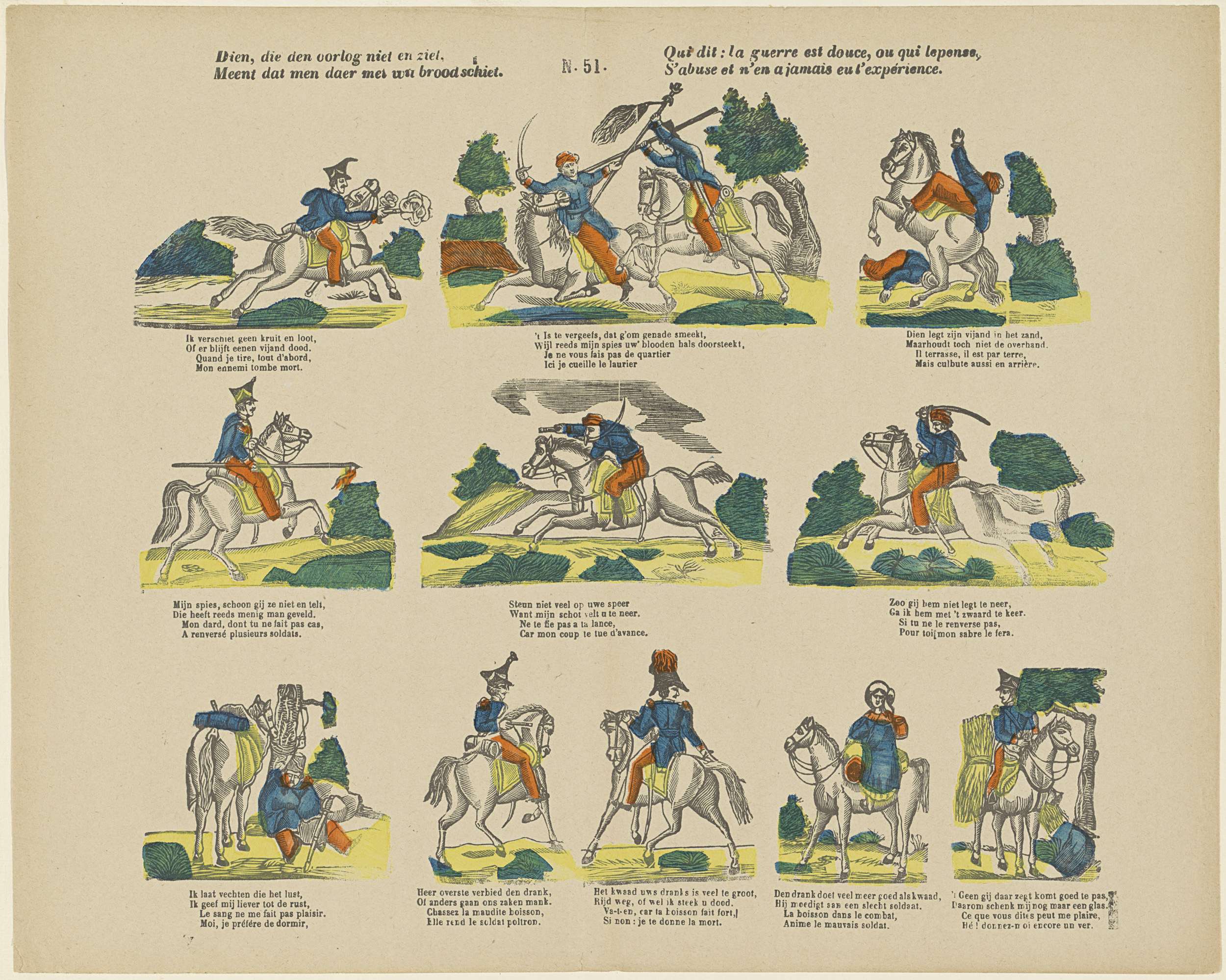 Blad met 11 voorstellingen van militairen te paard. Onder elke voorstelling een tweeregelig vers in het Nederlands en het Frans. Genummerd midden boven: N. 51.