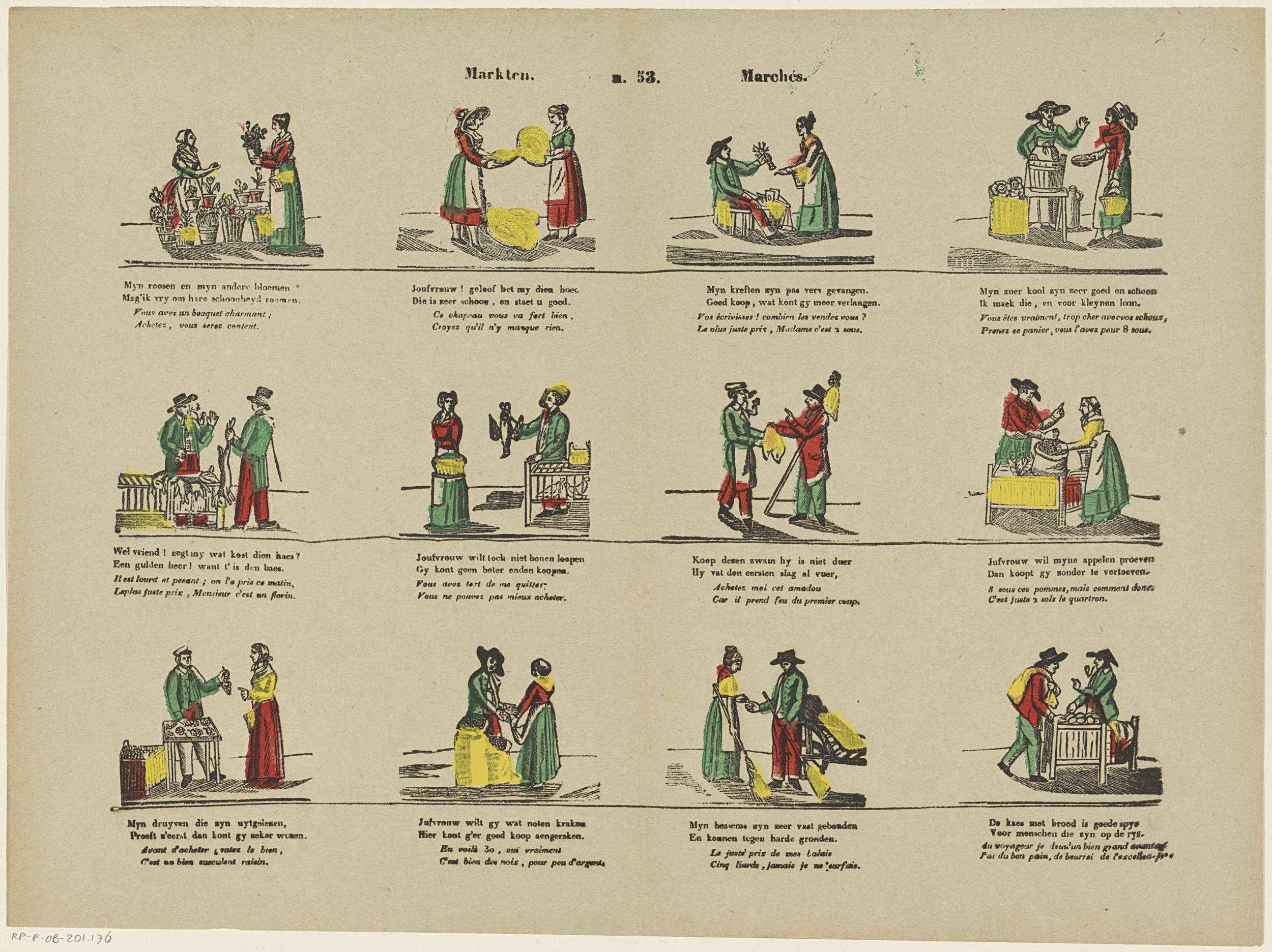 Blad met 12 voorstellingen van straatverkopers. Onder elke voorstelling een tweeregelig vers in het Nederlands en het Frans. Genummerd midden boven: n. 53.