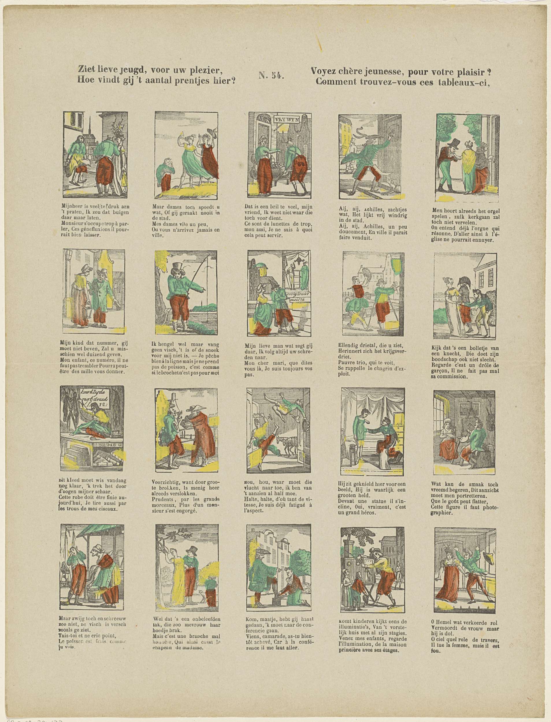 Blad met 20 voorstellingen van verschillende figuren en bezigheden, bijvoorbeeld een visser die niets vangt, een schilder die een portret schildert en acteurs die een toneelstuk opvoeren. Onder elke voorstelling een onderschrift in het Nederlands en het Frans. Genummerd midden boven: N. 54.