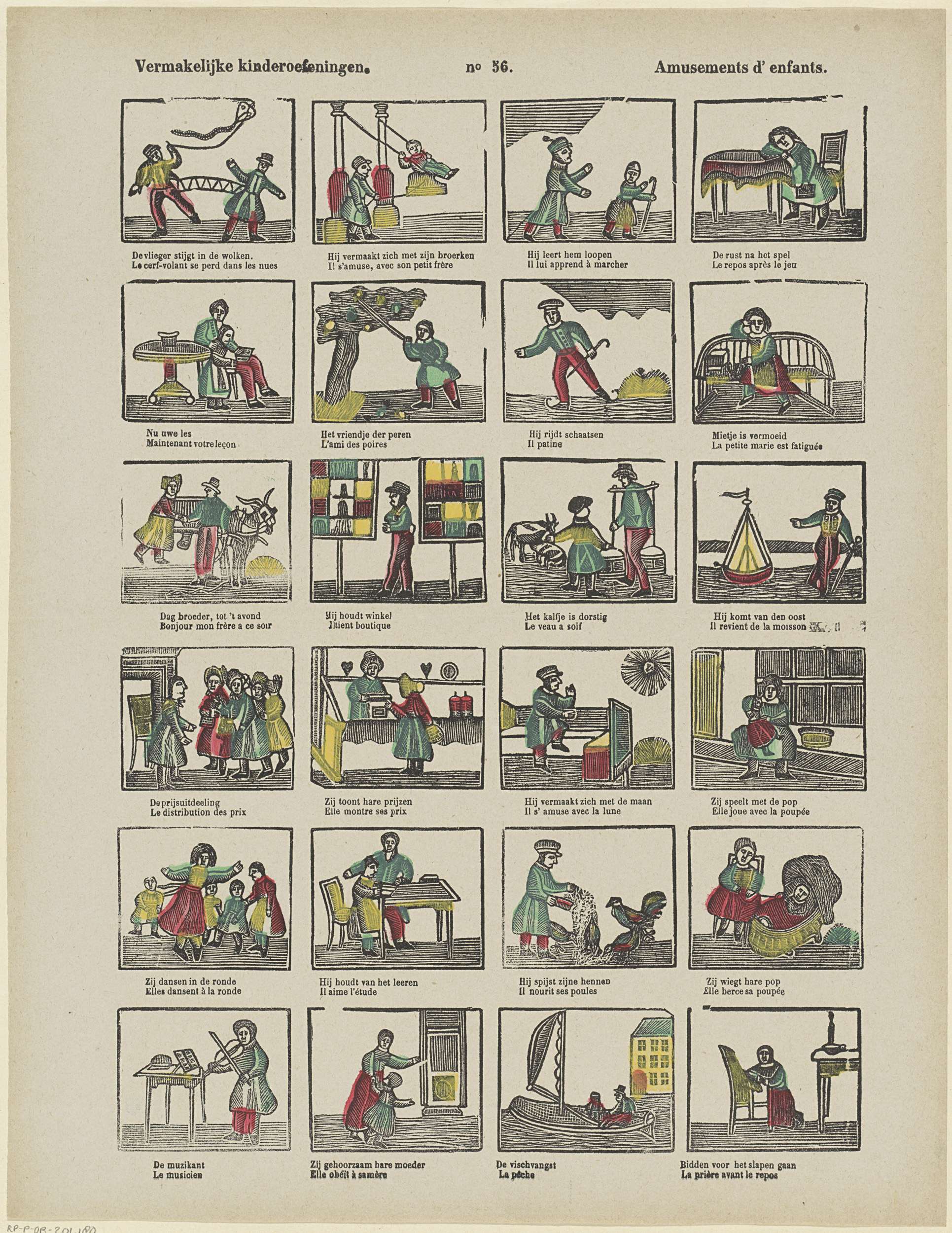 Blad met 24 voorstellingen van kinderspelen en bezigheden, zoals schommelen, leren lopen, dansen en bidden voor het slapengaan. Onder elke voorstelling een onderschrift in het Nederlands en het Frans. Genummerd midden boven: no 56.