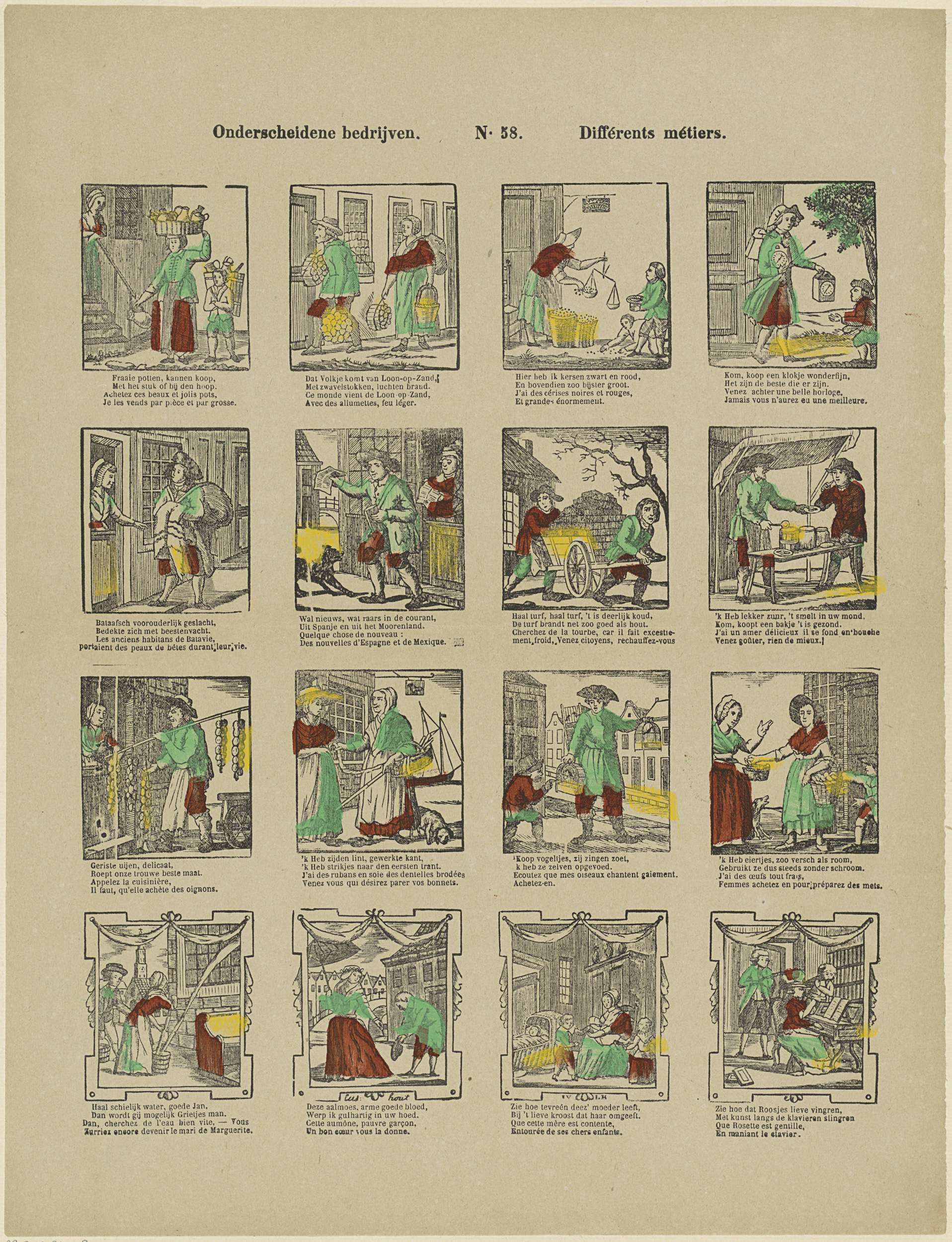Blad met 16 voorstellingen van ambachtslieden, beroepen en bezigheden, zoals straatverkopers, het geven van een aalmoes en klavier spelen. Onder elke voorstelling een tweeregelig vers in het Nederlands en in het Frans. Genummerd midden boven: N. 58.