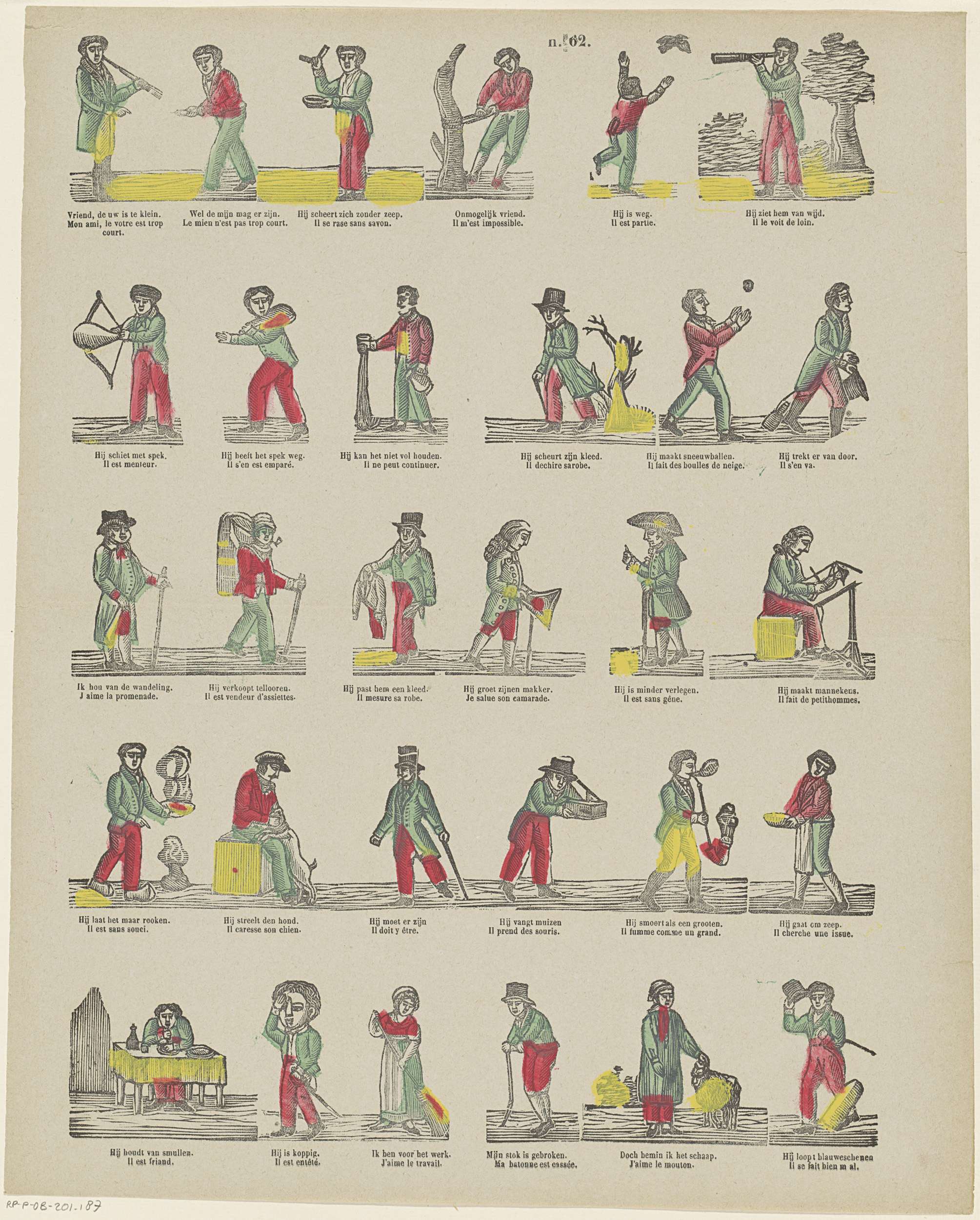 Blad met 30 verbeeldingen van spreekwoorden en gezegden. Onder elke voorstelling het spreekwoord of gezegde in het Nederlands en in het Frans. Genummerd midden boven: n. 62.