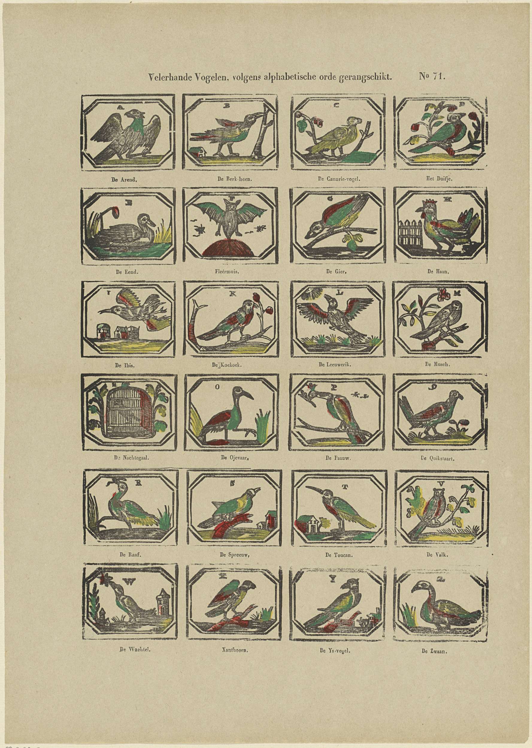 Blad met 24 voorstellingen van de letters van het alfabet geïllustreerd met vogels en een vleermuis waarvan de woorden met de betreffende letter beginnen. Onder elke afbeelding een onderschrift. Genummerd rechtsboven: No 71.