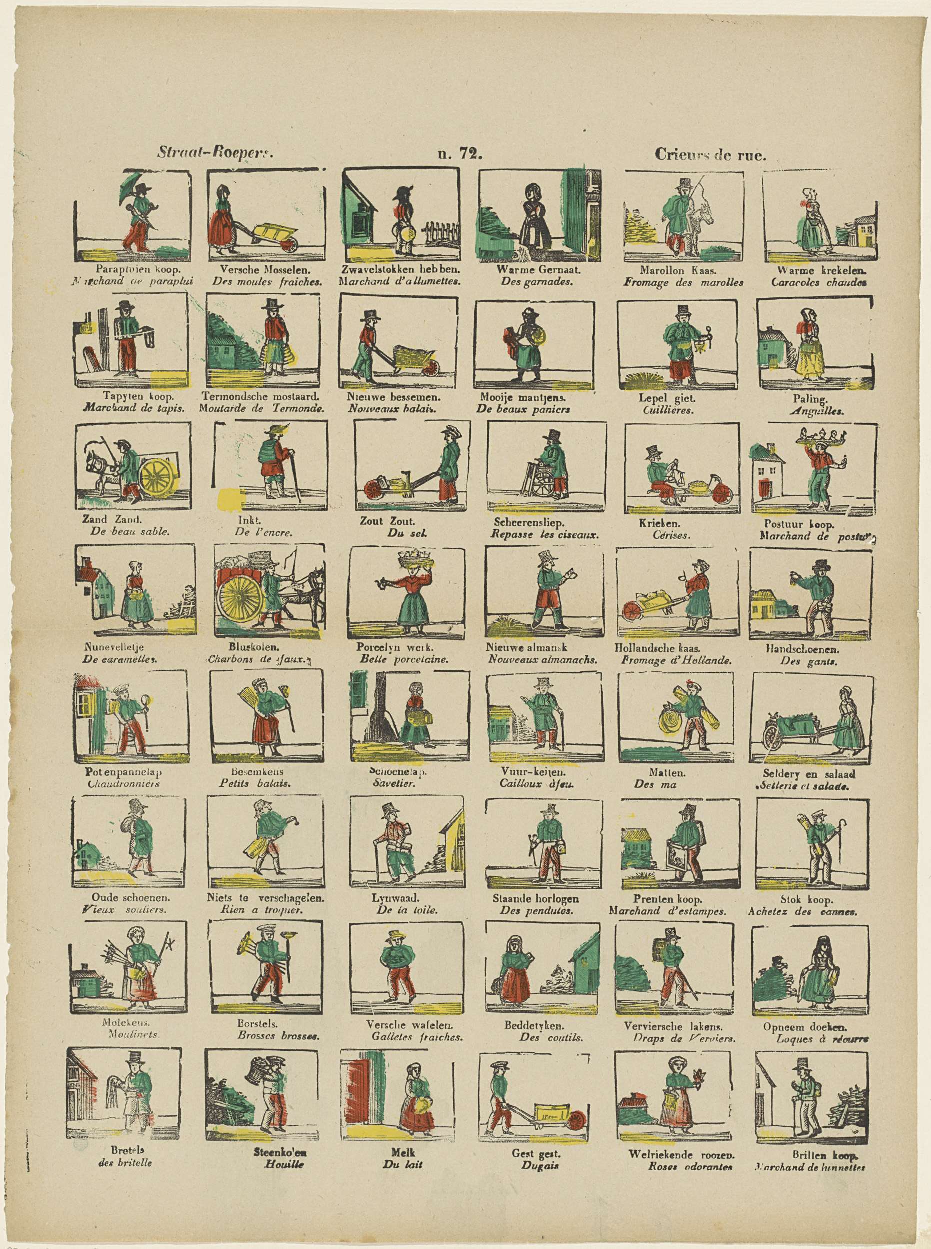 Blad met 48 voorstellingen van straatverkopers, zoals een bezemverkoper, een kaasverkoper en een rozenverkoopster. Onder elke afbeelding een onderschrift in het Nederlands en in het Frans. Genummerd midden boven: n. 72.