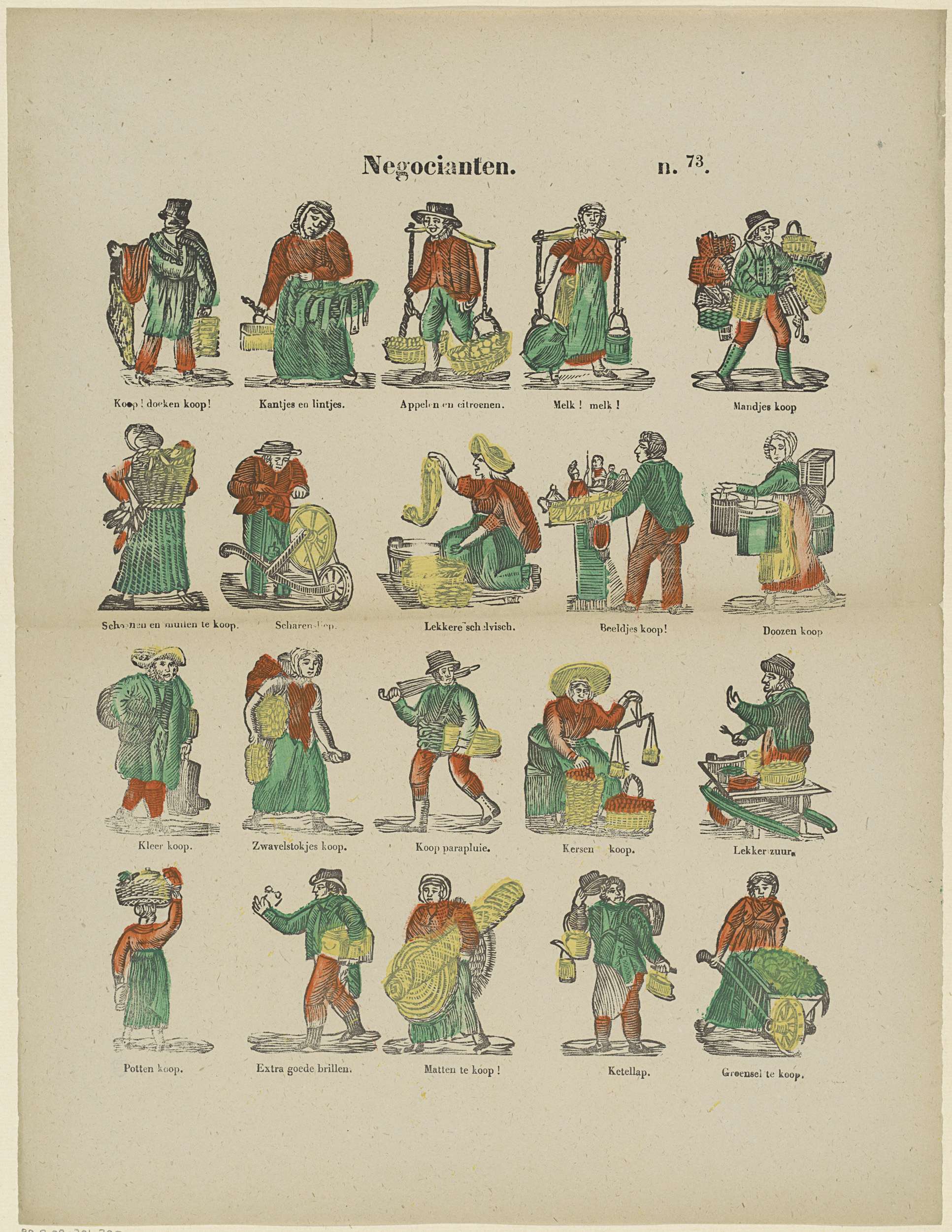 Blad met 20 voorstellingen van straatverkopers, zoals een appels- en citroenenverkoper, een melkmeid en een kersenverkoopster. Onder elke afbeelding een onderschrift. Genummerd rechtsboven: n. 73.