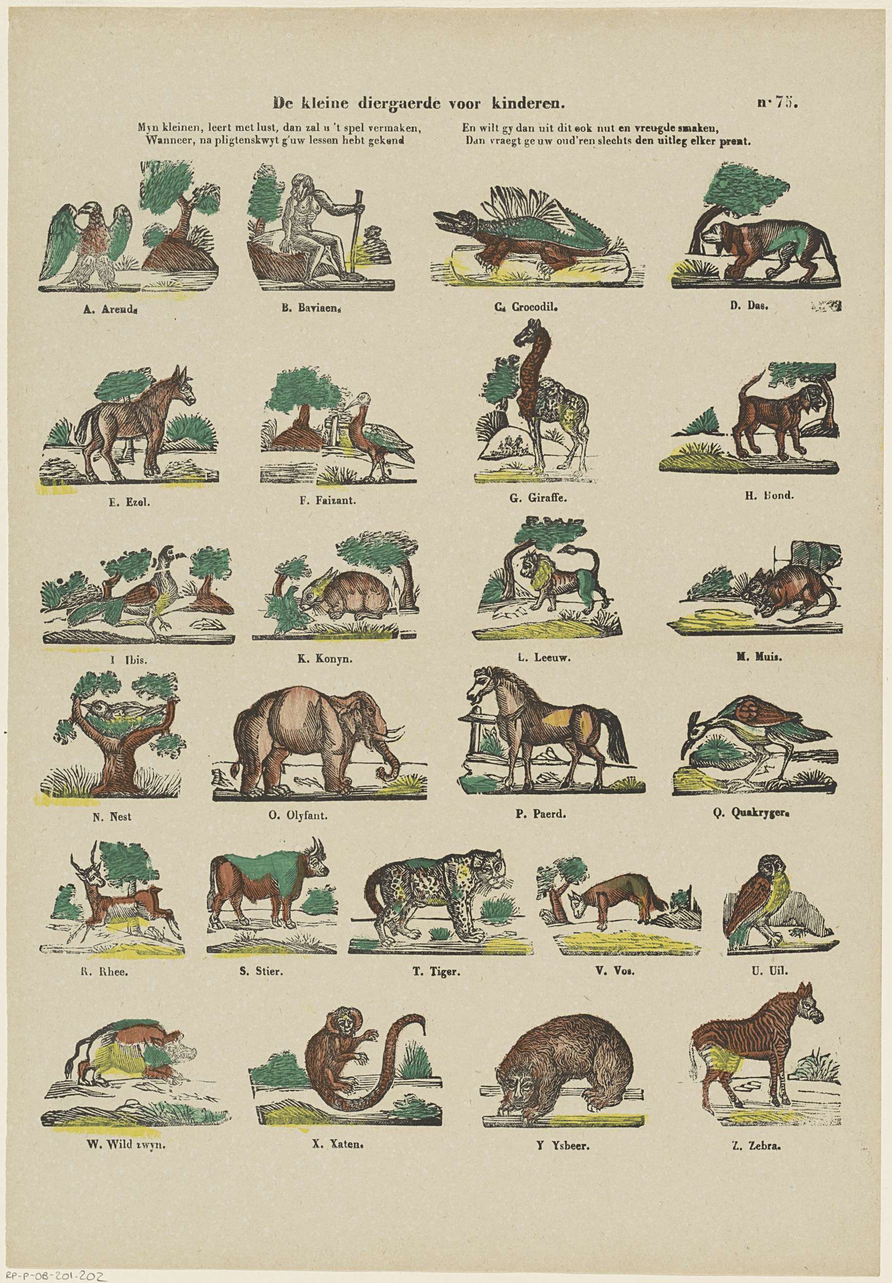 Blad met 24 voorstellingen van de letters van het alfabet geïllustreerd met dieren waarvan de woorden met de betreffende letter beginnen. Onder de titel een vierregelig vers, onder elke afbeelding een onderschrift. Genummerd rechtsboven: n. 75.