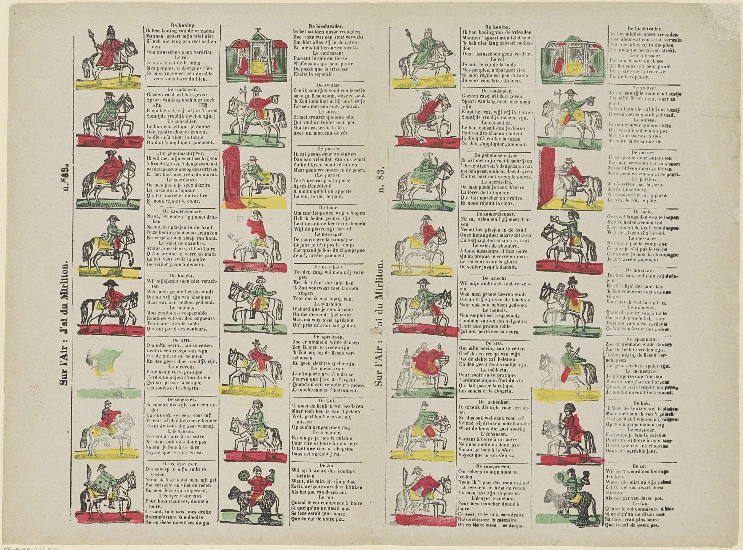 Blad met 32 voorstellingen (driekoningenbriefjes) van verschillende functies binnen het hof, waaronder een raadsheer, een voorproever en de zot. Rechts naast elke afbeelding een vierregelig vers in het Nederlands en in het Frans. Genummerd midden links: n. 83. Genummerd midden: n. 83.