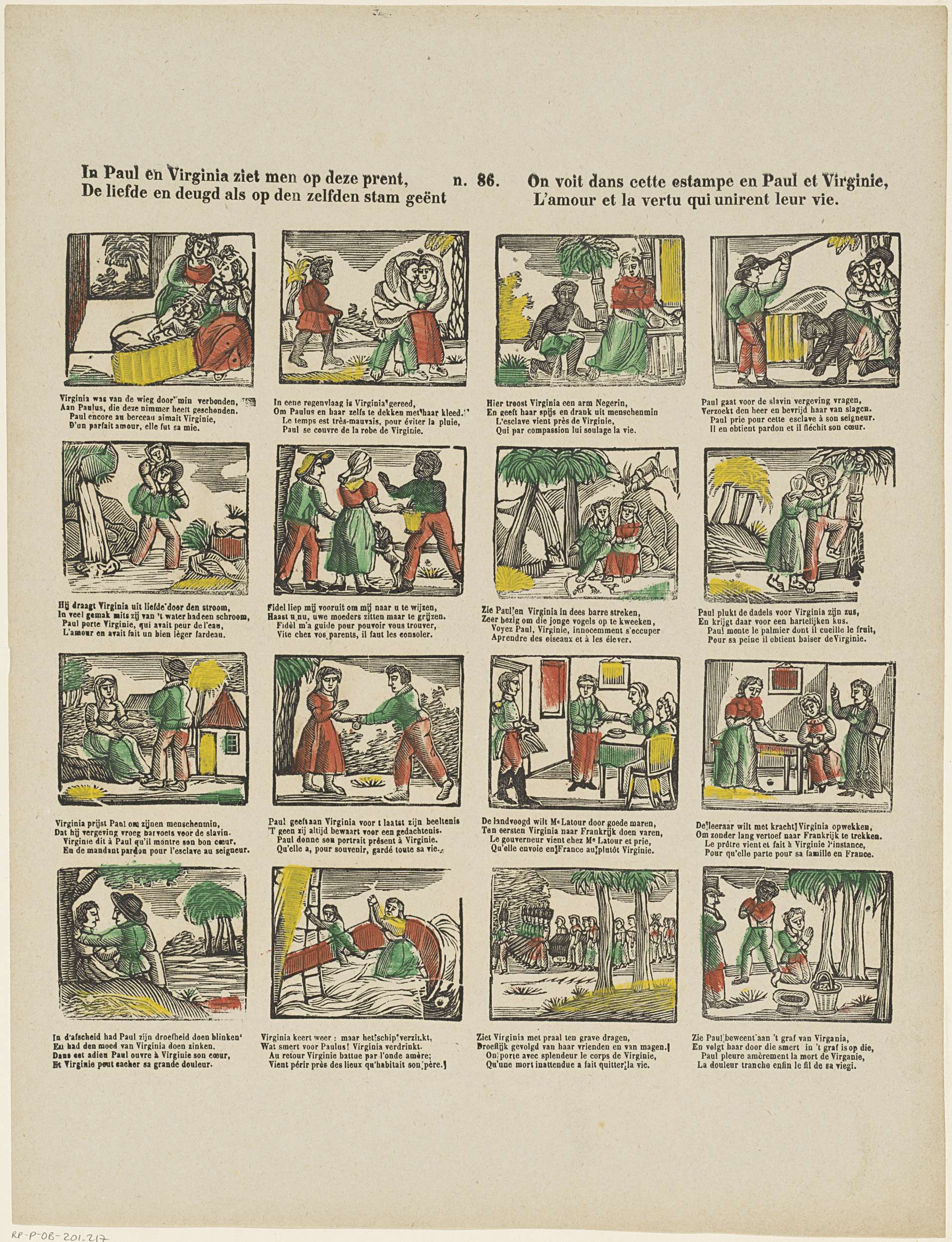 Blad met 16 voorstellingen uit het verhaal van Paul en Virginia. Virginia verdrinkt. Onder elke voorstelling een tweeregelig vers in het Nederlands en in het Frans. Genummerd midden boven: n. 86.