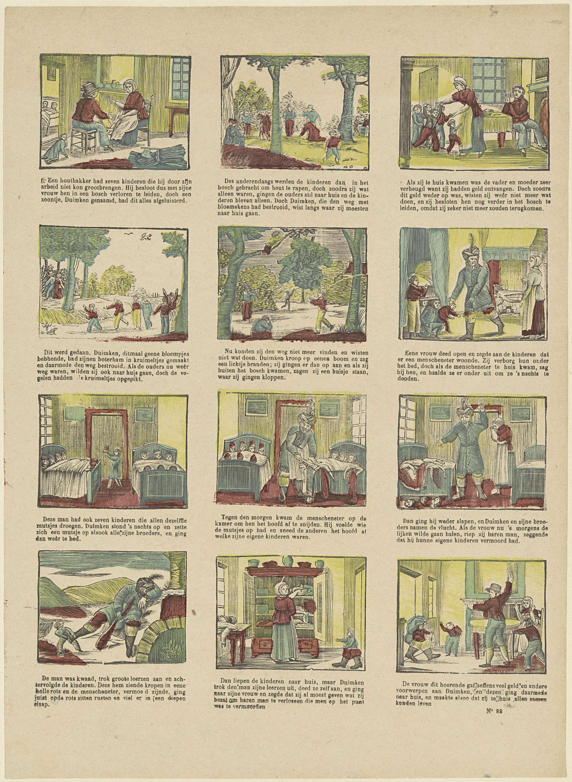 Blad met 12 voorstellingen uit het sprookje van Klein Duimpje. Onder elke afbeelding een onderschrift. Genummerd rechtsonder: No 88.