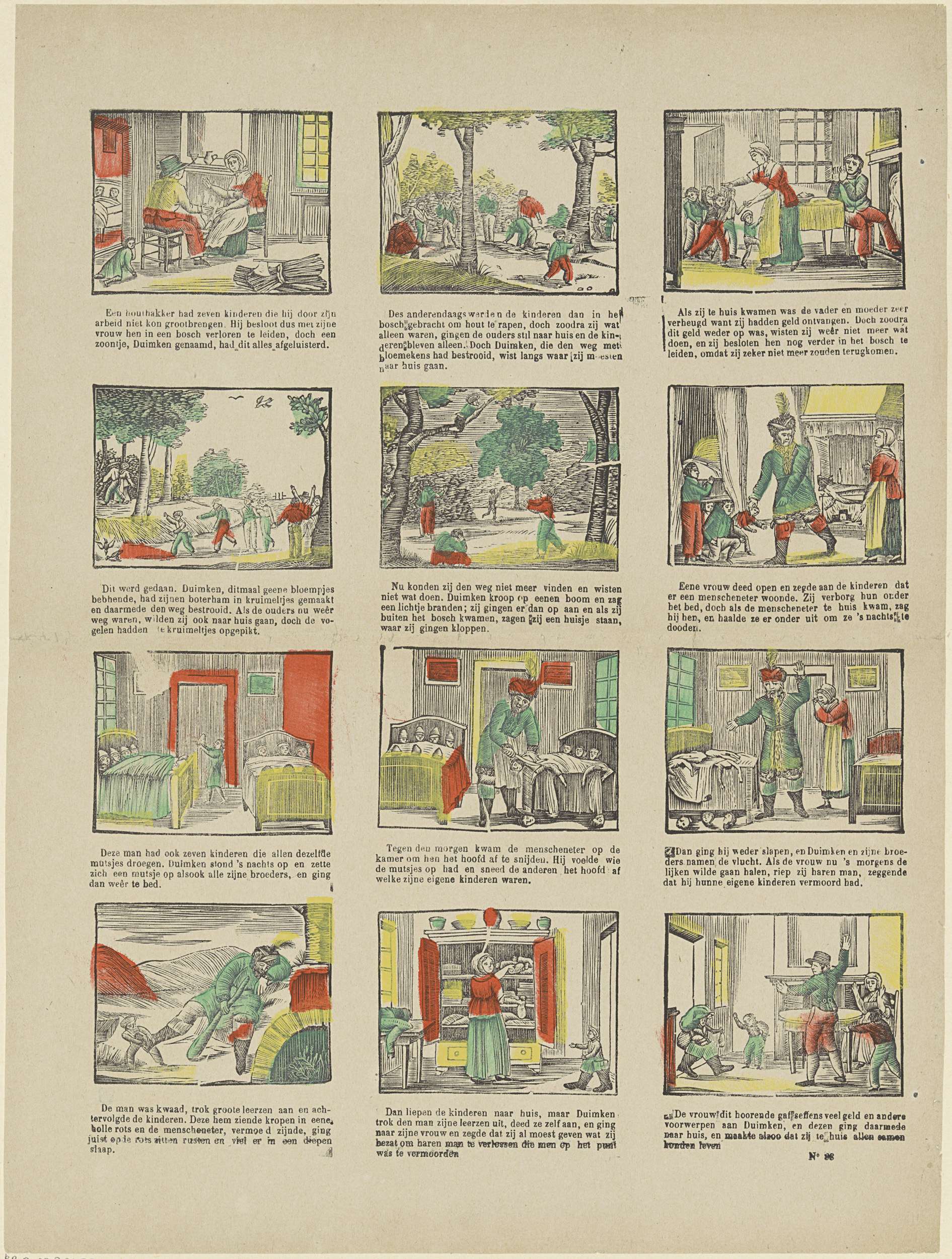 Blad met 12 voorstellingen uit het sprookje van Klein Duimpje. Onder elke afbeelding een onderschrift. Genummerd rechtsonder: No 88.