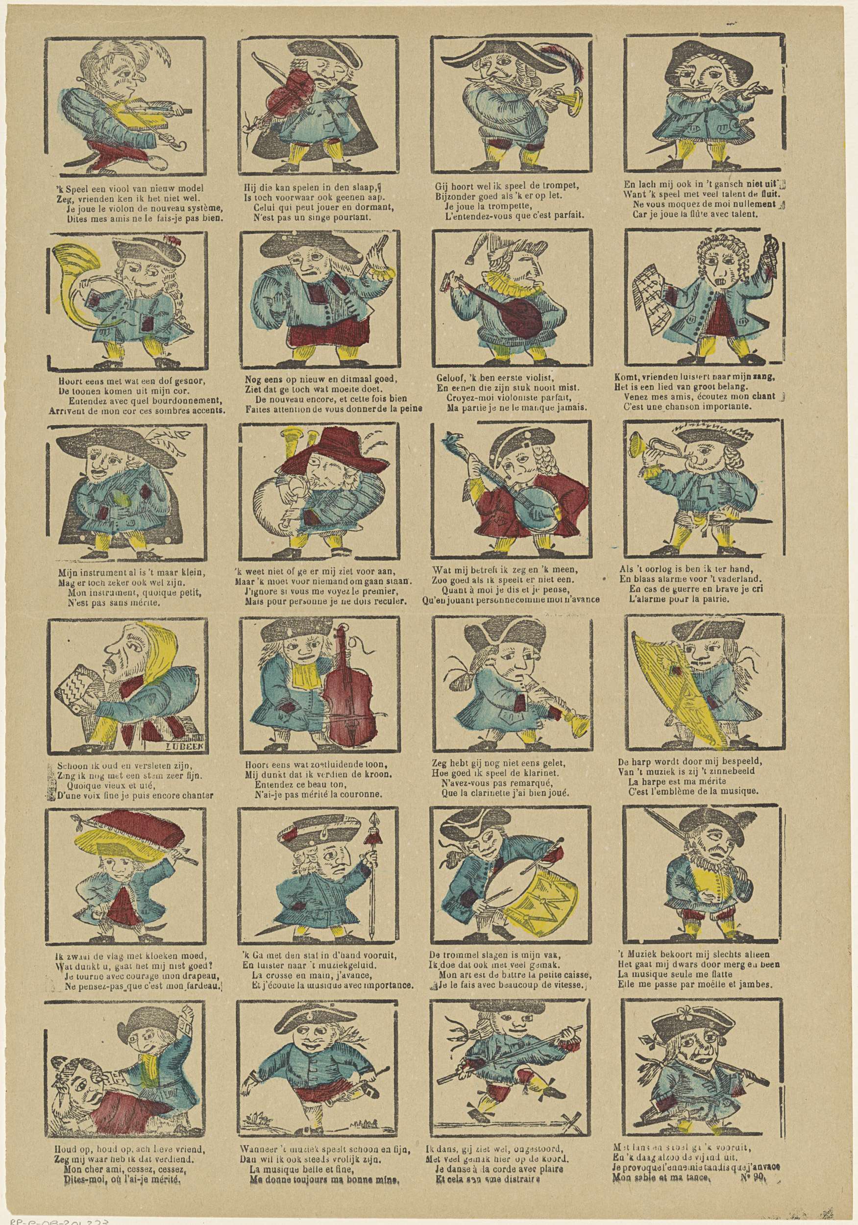 Blad met 24 voorstellingen van muzikanten, waaronder een met een viool, een met een banjo en een met een trommel. Onder elke afbeelding een tweeregelig vers in het Nederlands en in het Frans. Genummerd rechtsonder: No 90.