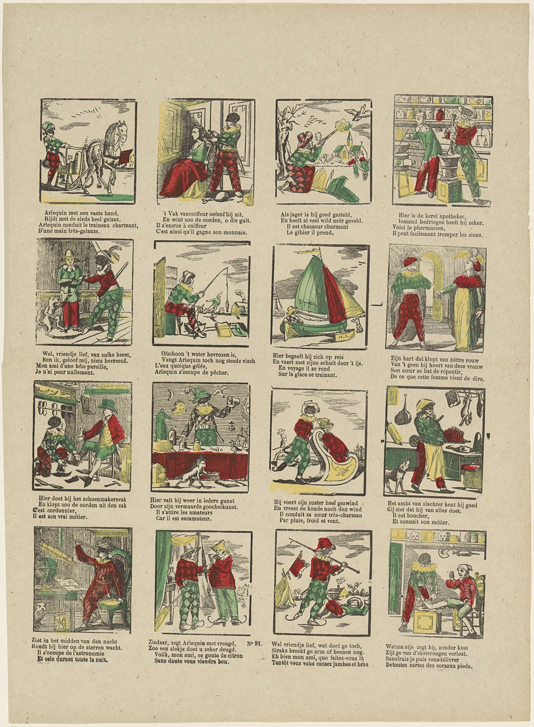 Blad met 16 voorstellingen over het leven van Harlekijn. Onder elke afbeelding een tweeregelig vers in het Nederlands en in het Frans. Genummerd midden onder: No 91.