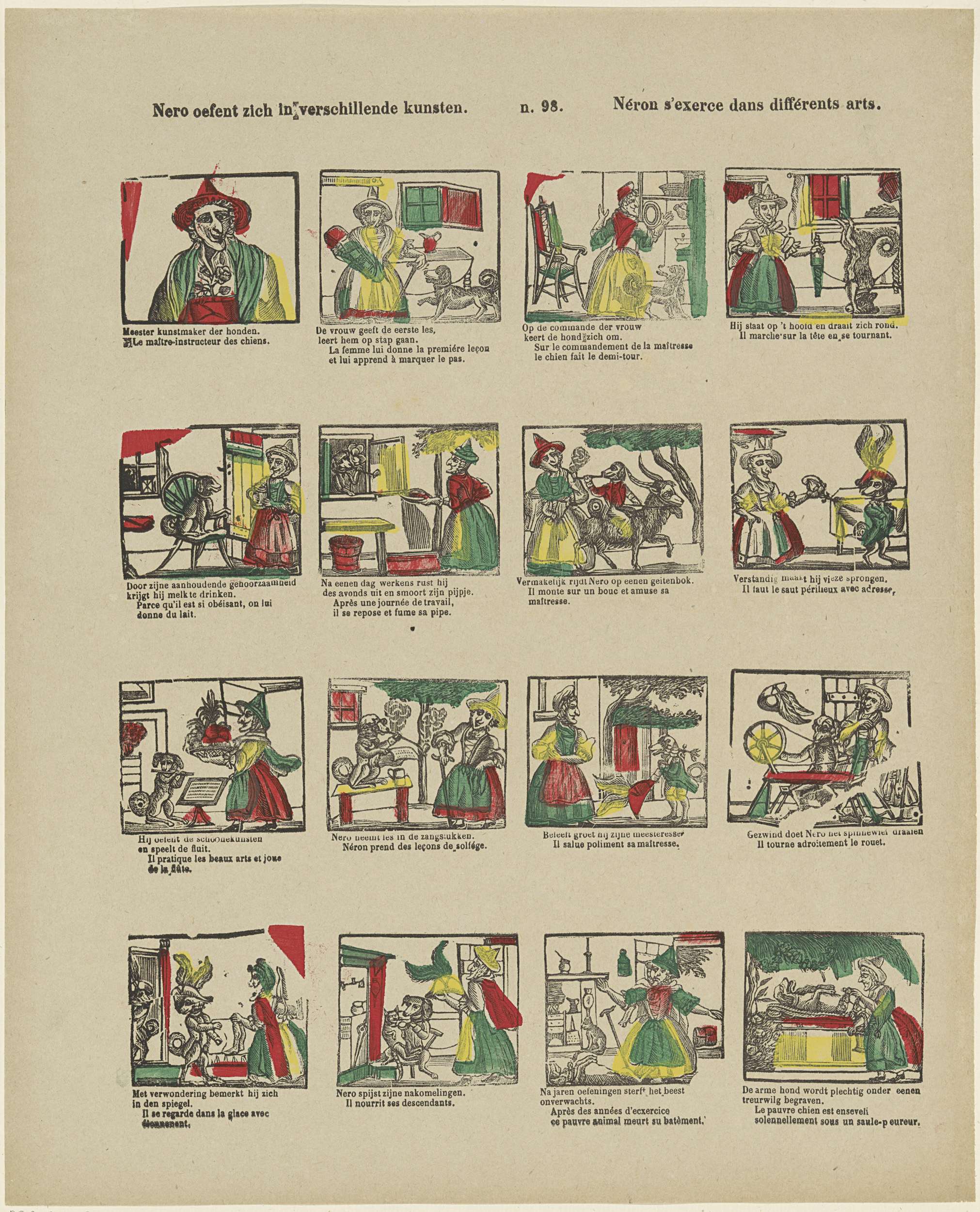 Blad met 16 voorstellingen van de hond Nero die kunstjes geleerd krijgt van zijn bazin. Onder elke afbeelding een tweeregelig vers in het Nederlands en in het Frans. Genummerd midden boven: n. 98.