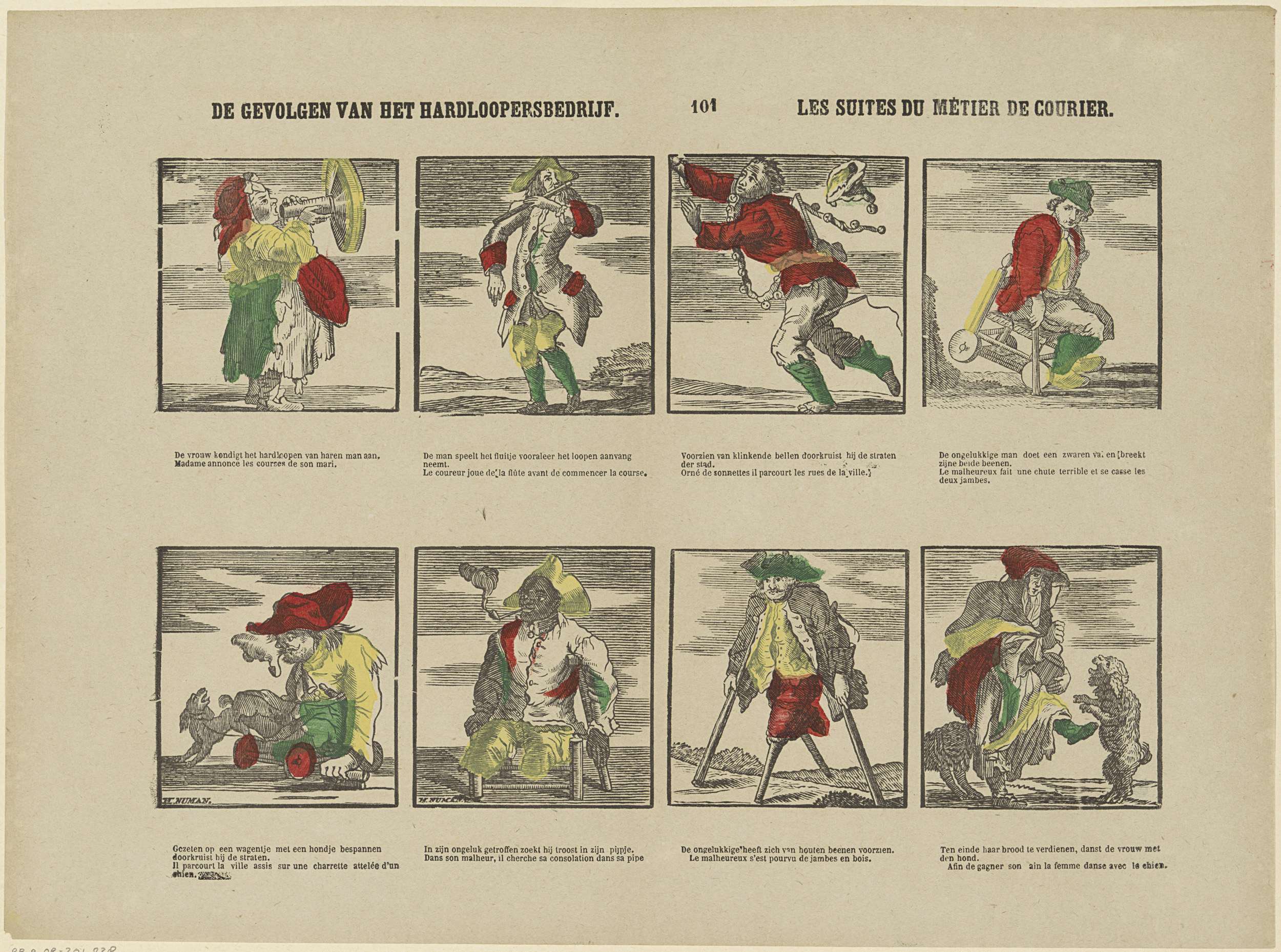 Blad met 8 voorstellingen van figuren, waaronder een fluit speler, een man zonder voeten en een vrouw die door een toeter zingt. Onder elke afbeelding een onderschrift in het Nederlands en in het Frans. Genummerd midden boven: 101.