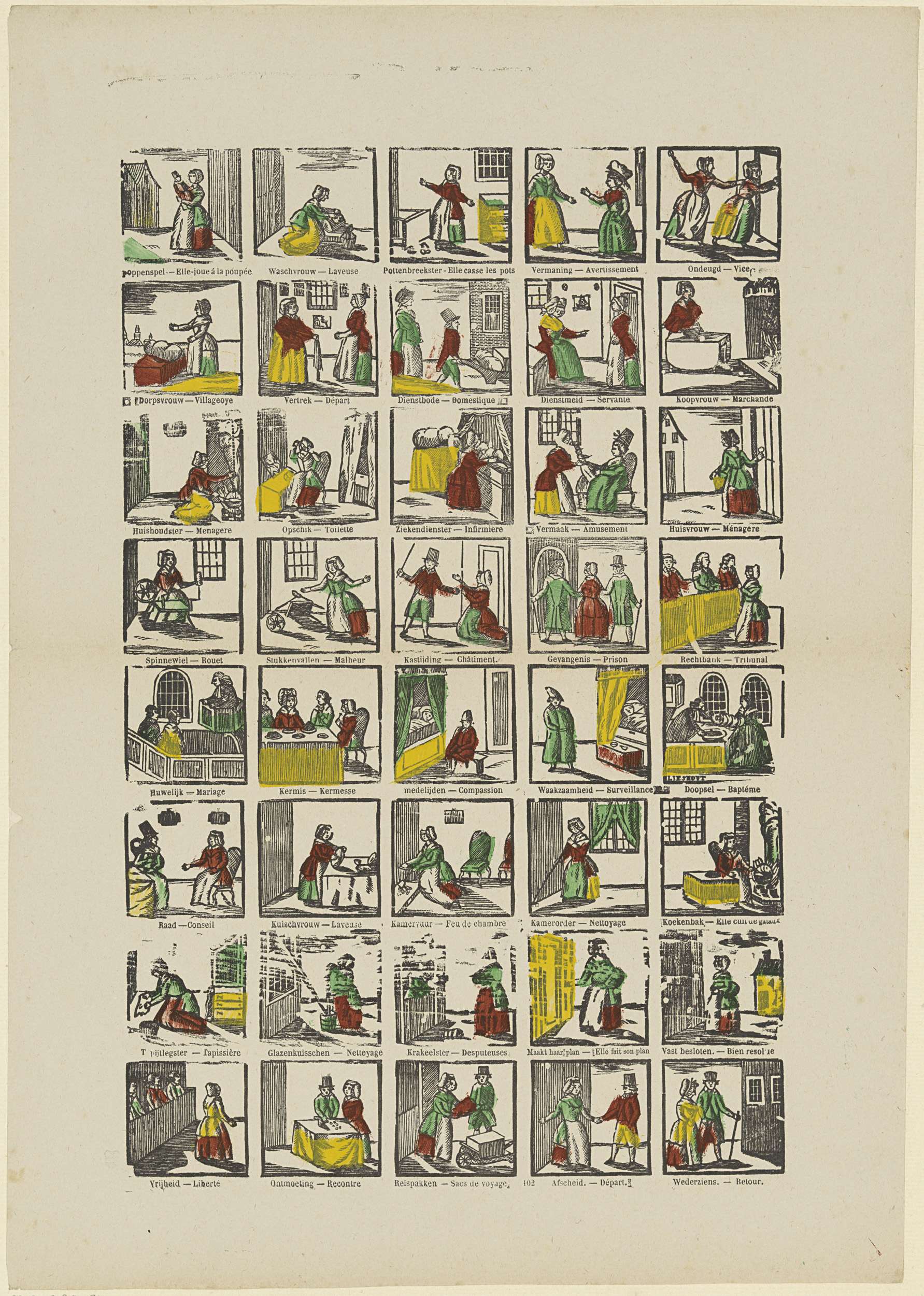 Blad met 40 voorstellingen van dienstmeisjes aan het werk, een huwelijk, een doopsel en een man en vrouw die afscheid nemen. Onder elke afbeelding een onderschrift in het Nederlands en in het Frans. Genummerd midden onder: 102.