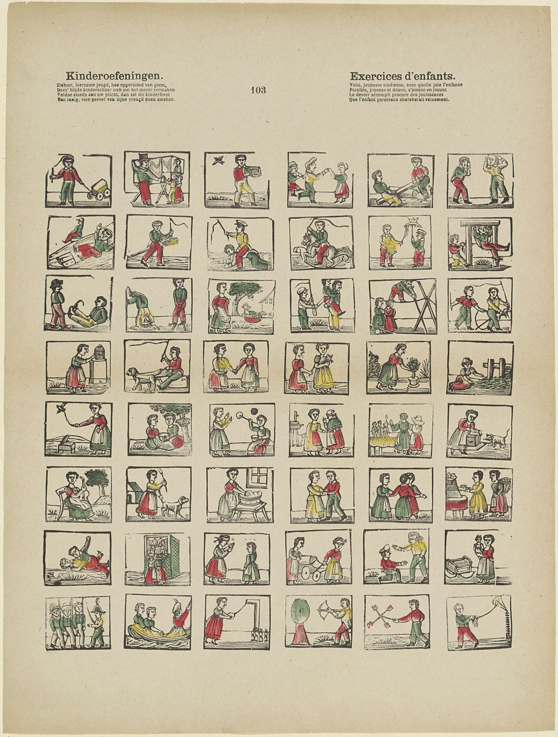Blad met 42 voorstellingen van kinderspelen en vermaak, waaronder wippen, koorddansen, bellen blazen, vliegeren en boogschieten. Onder de titel een vierregelig vers in het Nederlands en in het Frans. Genummerd midden boven: 103.