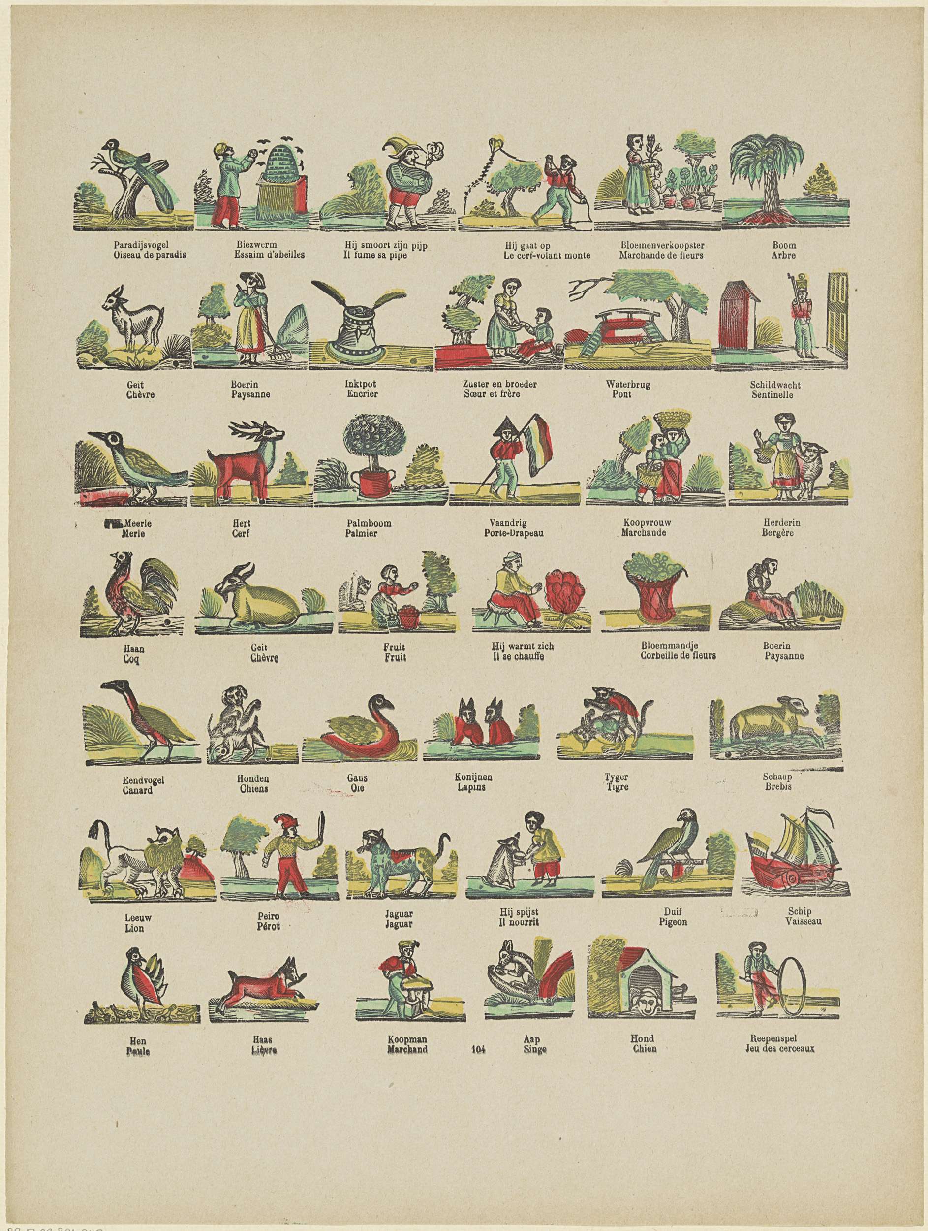 Blad met 42 voorstellingen van dieren, figuren en voorwerpen, waaronder een bloemenverkoopster, een hert en een schip. Onder elke afbeelding een onderschrift in het Nederlands en in het Frans. Genummerd midden onder: 104.