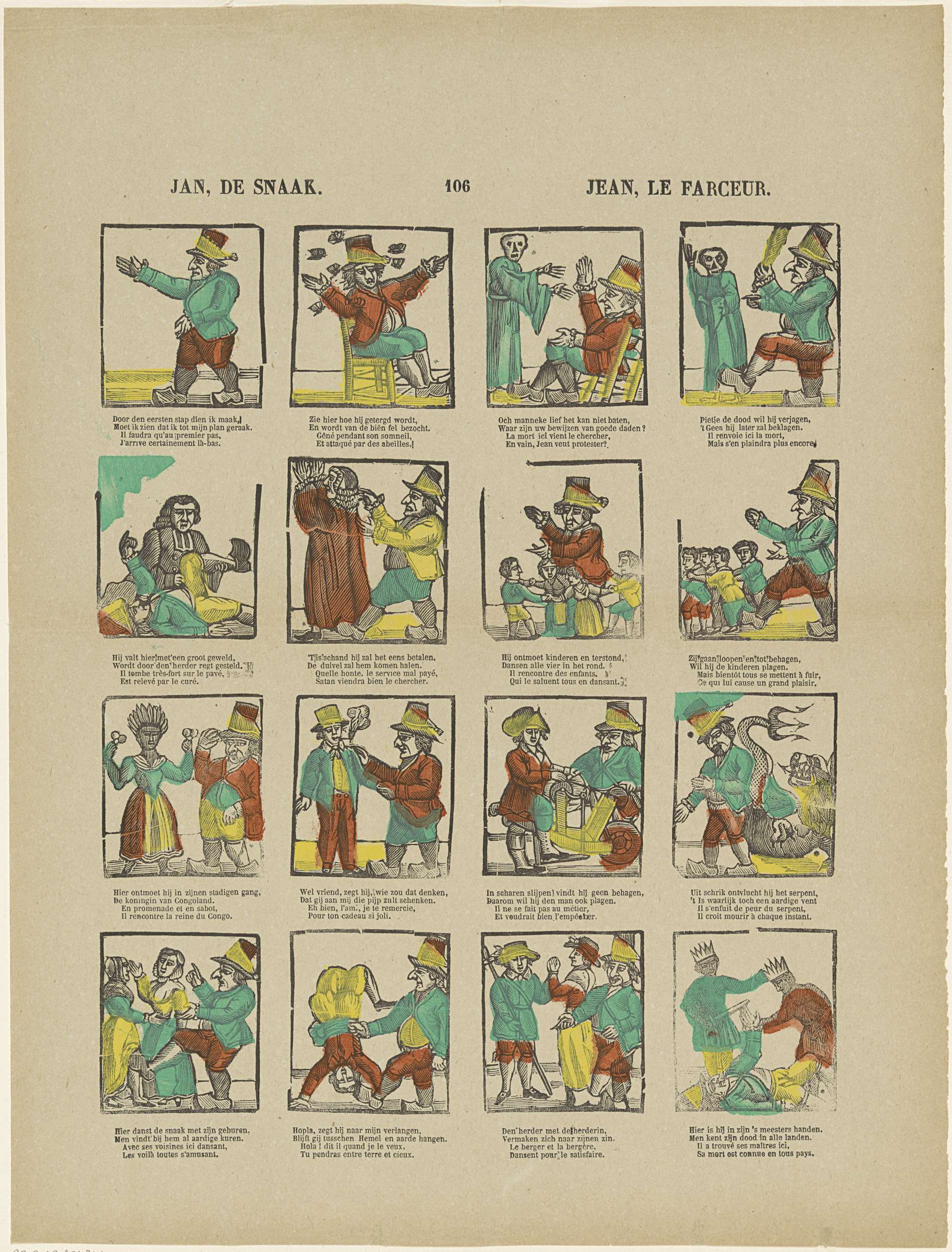 Blad met 16 voorstellingen van de kluchten van Jan Klaas. Onder elke afbeelding een tweeregelig vers in het Nederlands en in het Frans. Genummerd midden boven: 106.