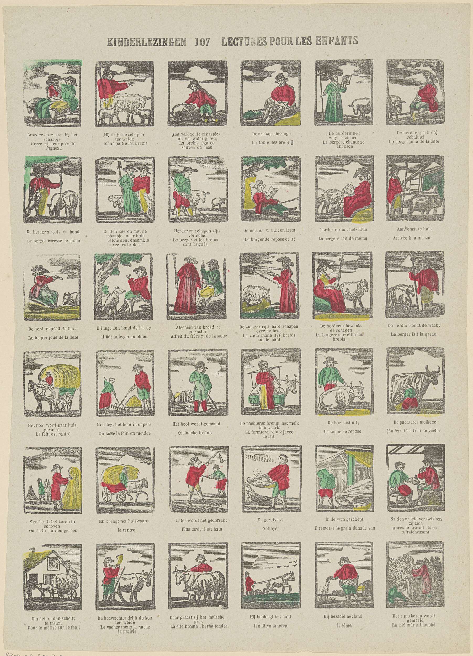 Blad met 36 voorstellingen van verschillende landelijke taferelen, waaronder een schapenscheerder, een herder met schapen en het oogsten van koren. Onder elke afbeelding een onderschrift in het Nederlands en in het Frans. Genummerd midden boven: 107.