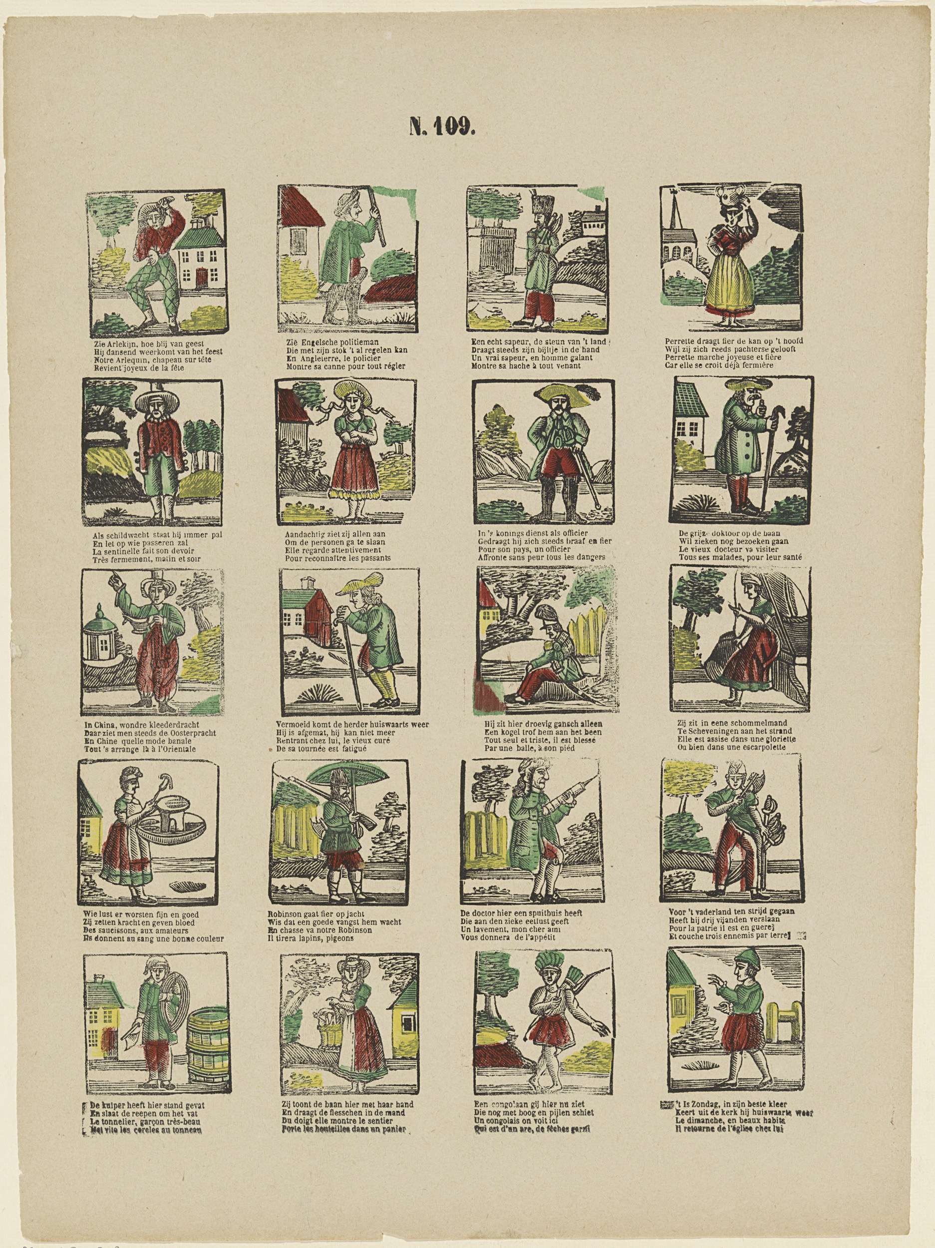 Blad met 20 voorstellingen van verschillende figuren en bezigheden, waaronder een Engelse politieman, een worstenverkoopster en een kuiper. Onder elke afbeelding een tweeregelig vers in het Nederlands en in het Frans. Genummerd midden boven: N. 109.