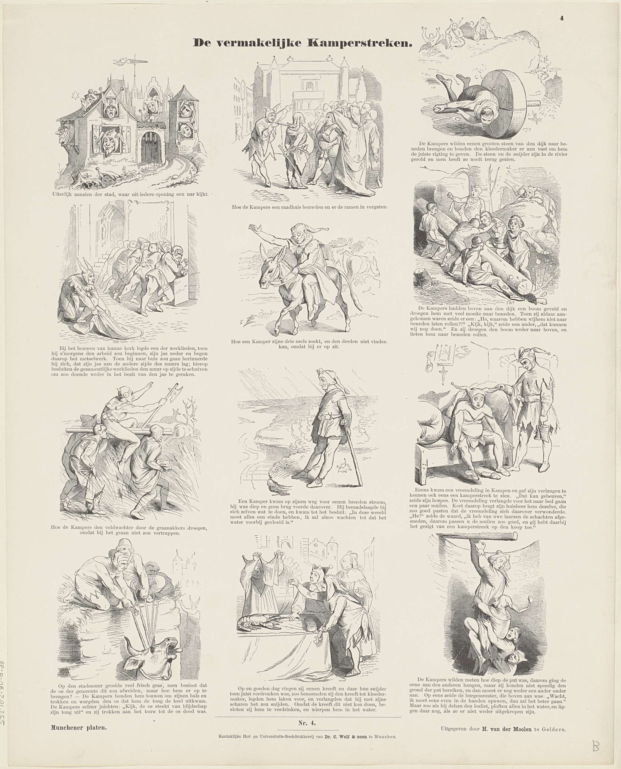 Blad met 12 voorstellingen over de vermeende domheid van de inwoners van Kampen. Onder elke voorstelling een onderschrift. Genummerd midden onder: Nr. 4. Genummerd rechtsboven: 4.